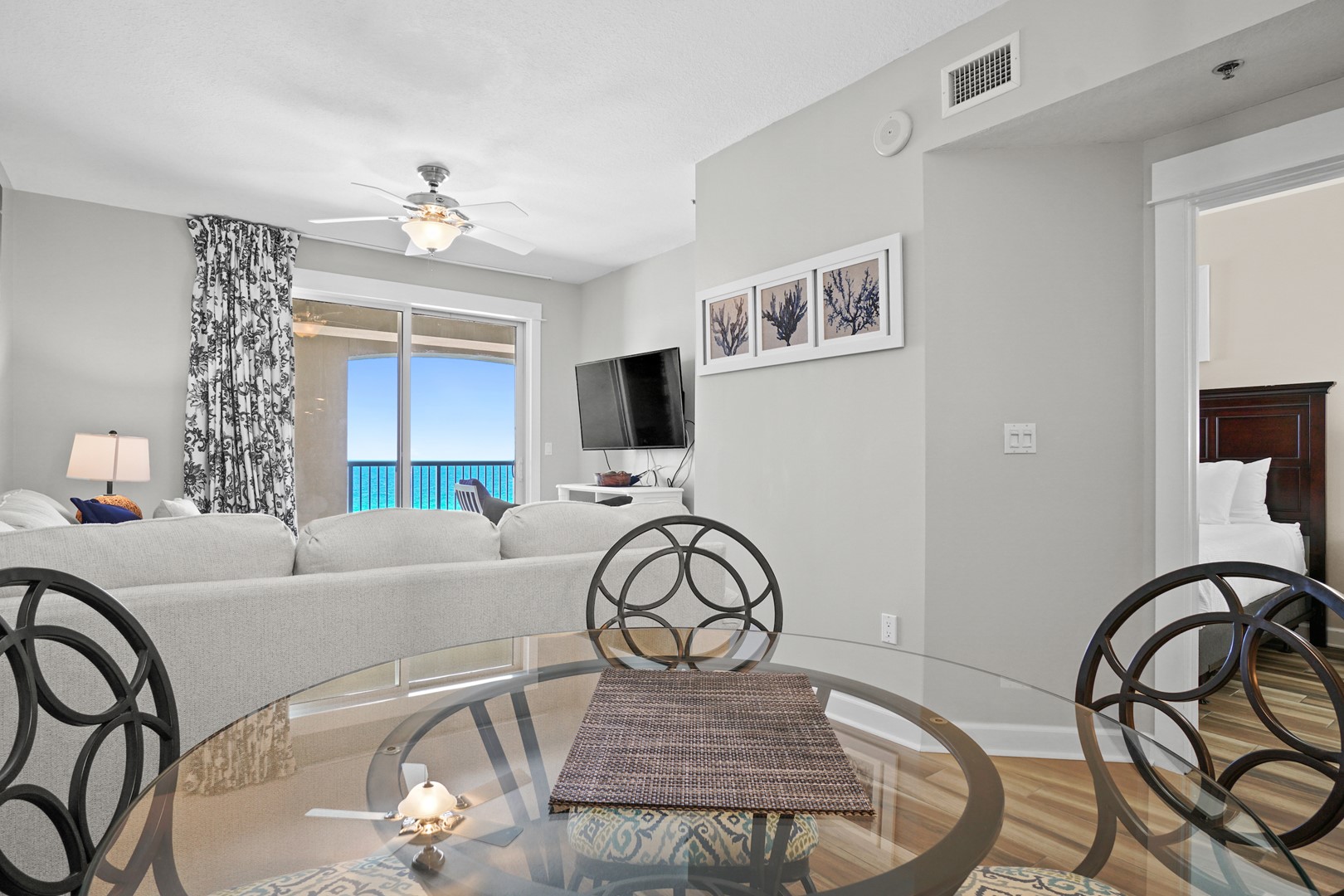 Grand Panama Beach Resort pet friendly condo rental 1-907 in Panama City Beach, FL by Panhandle Getaways is a 2 bedroom plus bunk area, 2 bathroom direct beachfront vacation rental complete with all of the conveniences of home. FREE ROUND OF GOLF EACH DAY OF YOUR STAY!