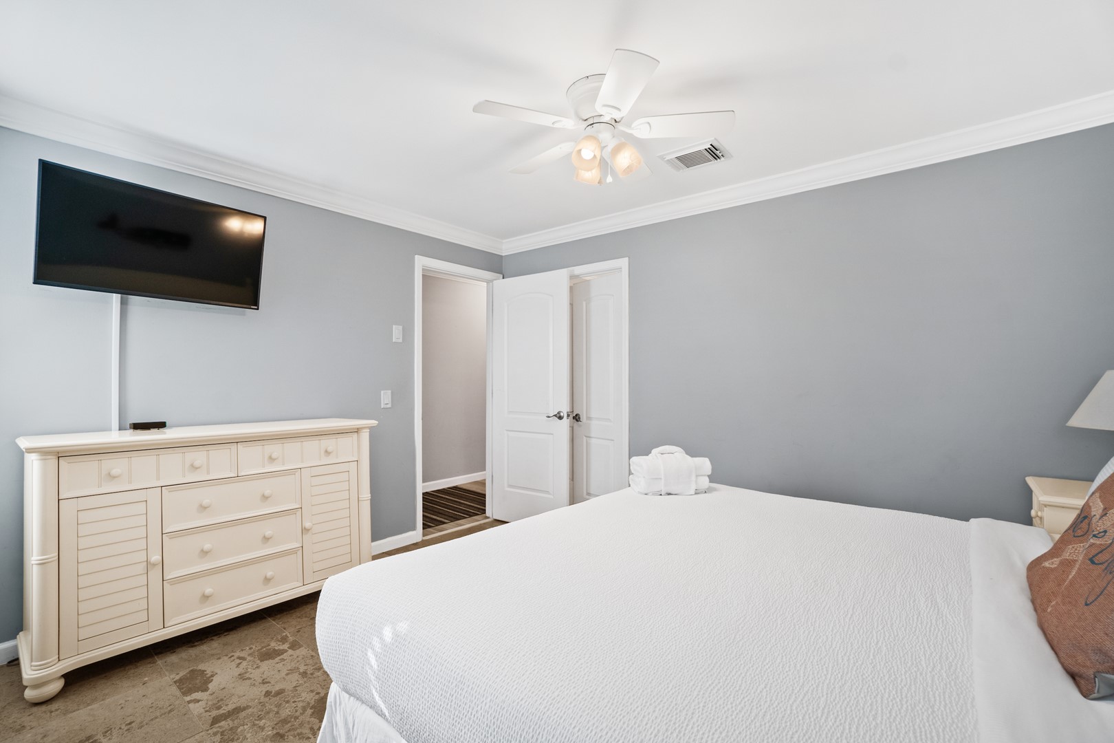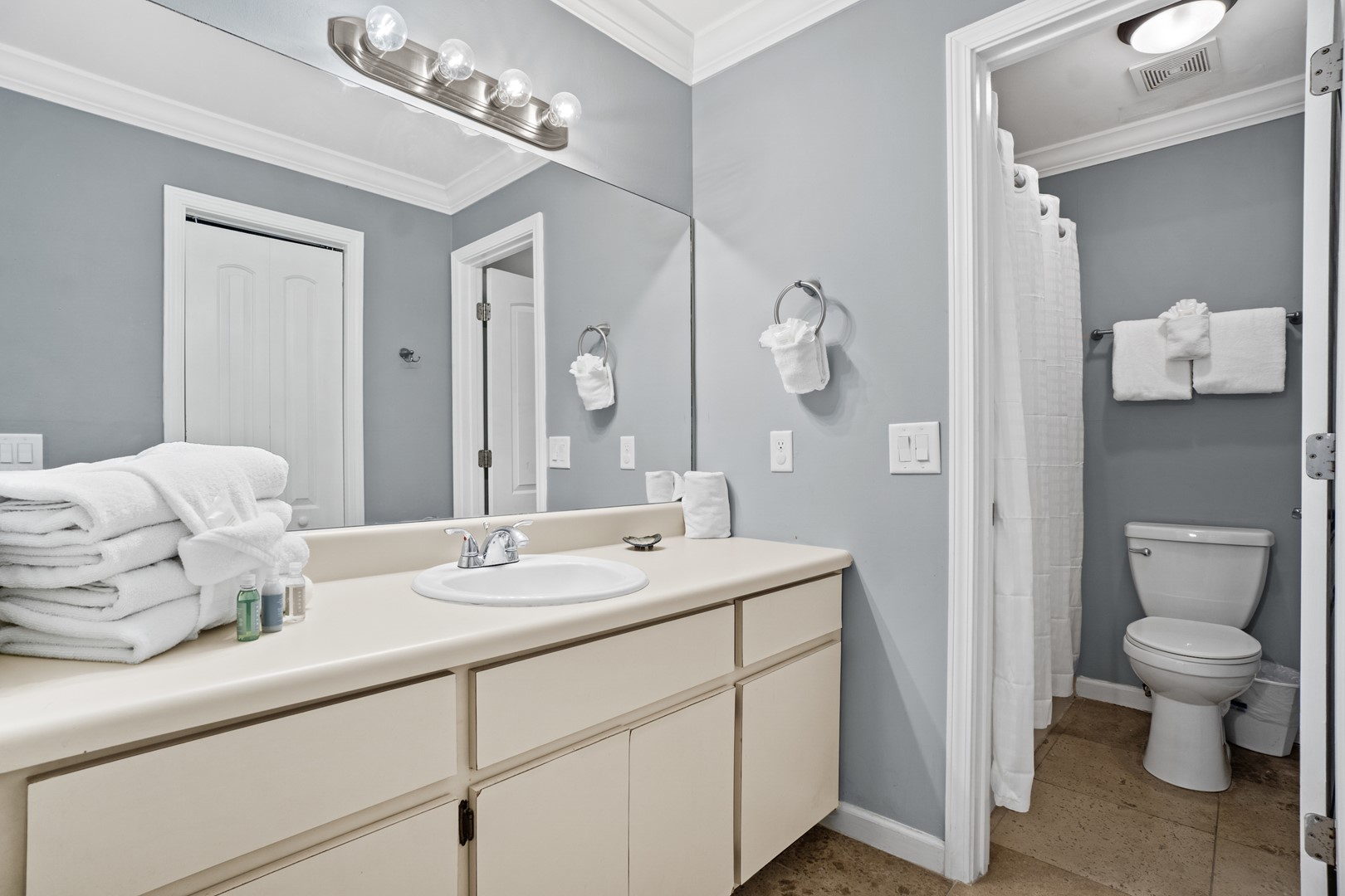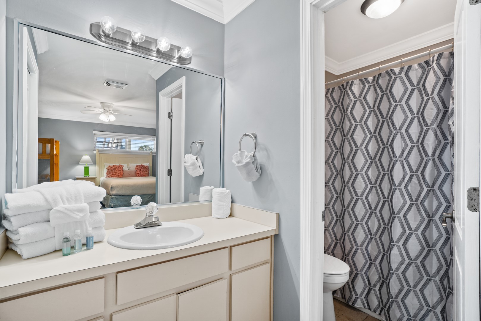 Panhandle Getaways furnishes a few essential items for guests to utilize until they can get to the grocery store. Initial Supplies include: Dishwasher soap, small washing machine powder, each bathroom has amenities (like hotel but NOT restocked) shampoo, conditioner, soap bar. One roll of toilet paper in each bathroom & one paper towel roll in the kitchen. All bed linens and towels are provided. We encourage guests to bring beach towels for use at the pool and beach.