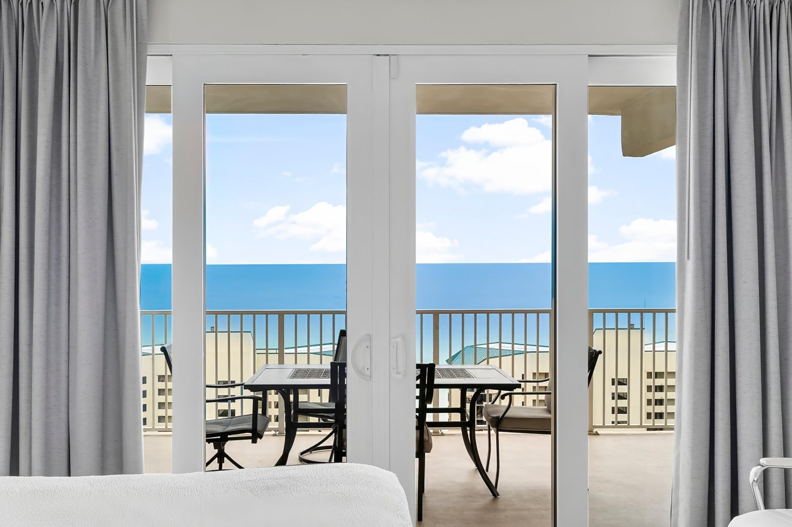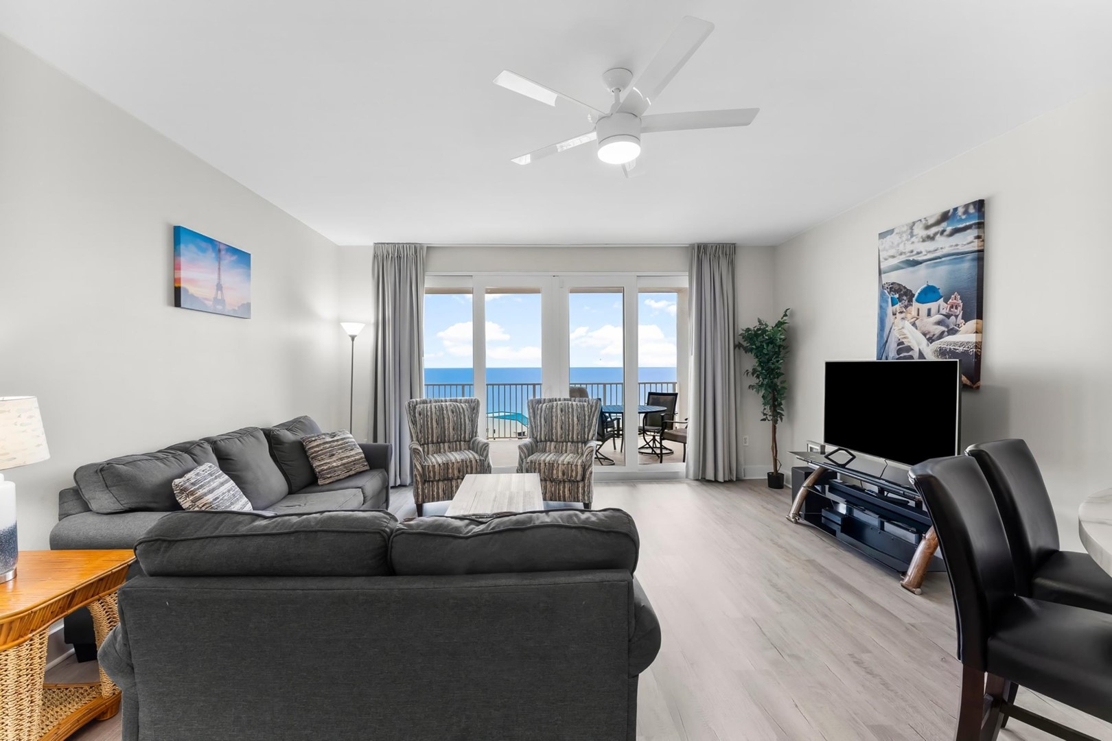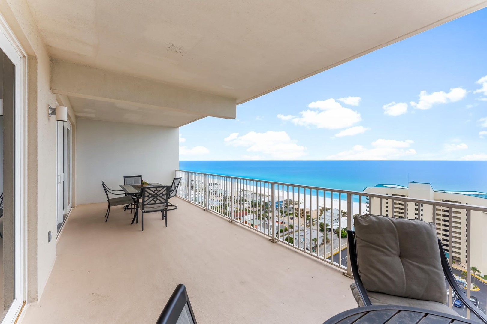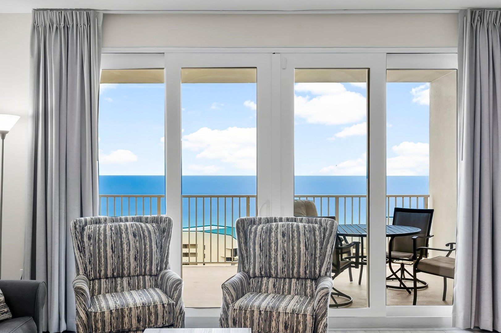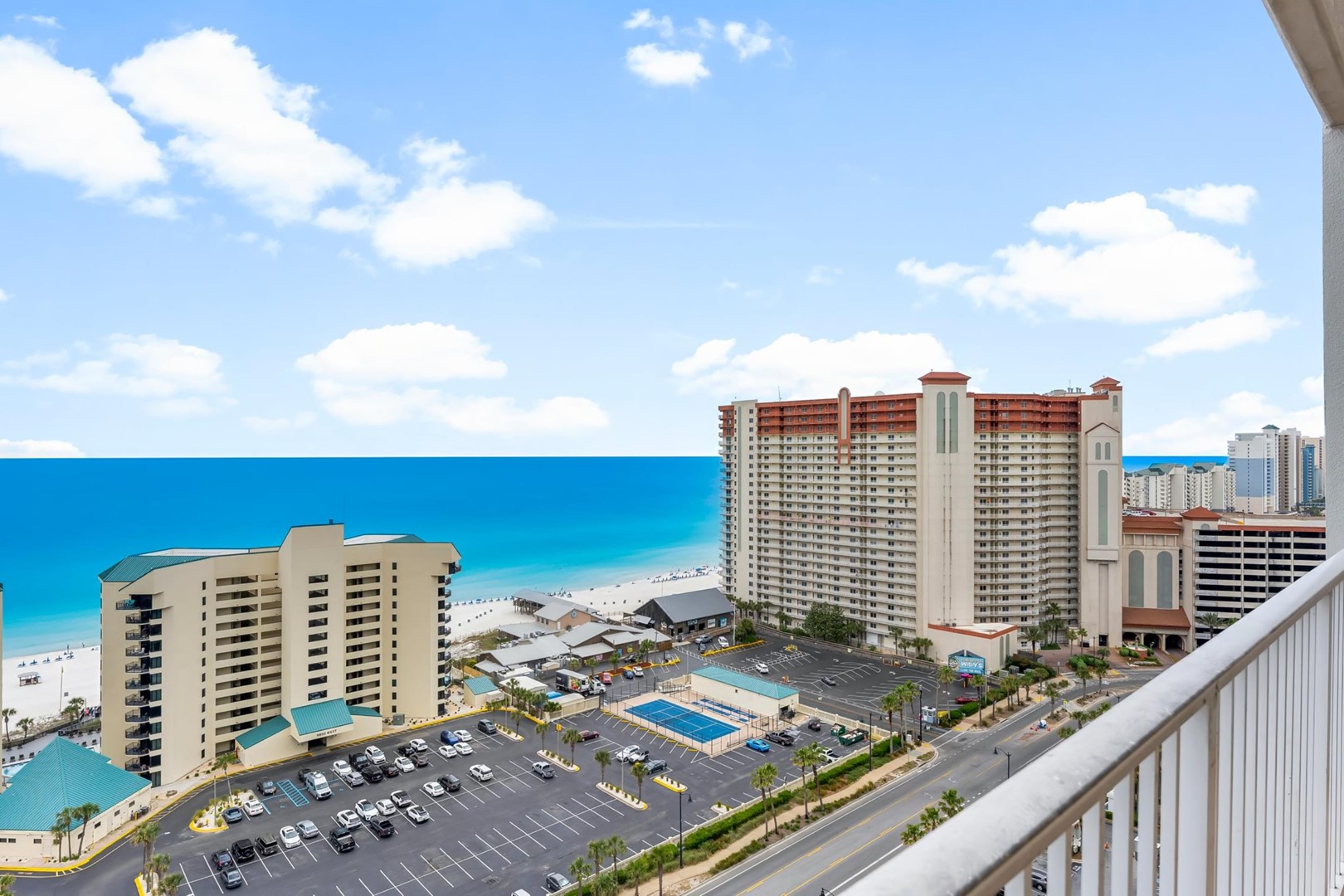 View ocean waters of the Gulf and feel the breeze while you relax on a huge covered balcony of this 3 Bedroom, 3 Bath condo from the 17th floor of this popular family/kids friendly resort in Panama City Beach. This condo sleeps up to 10 guests with a fully equipped kitchen, dining table, living room, sofa bed, bunk bed, patio furniture, and washer/dryer for laundry.