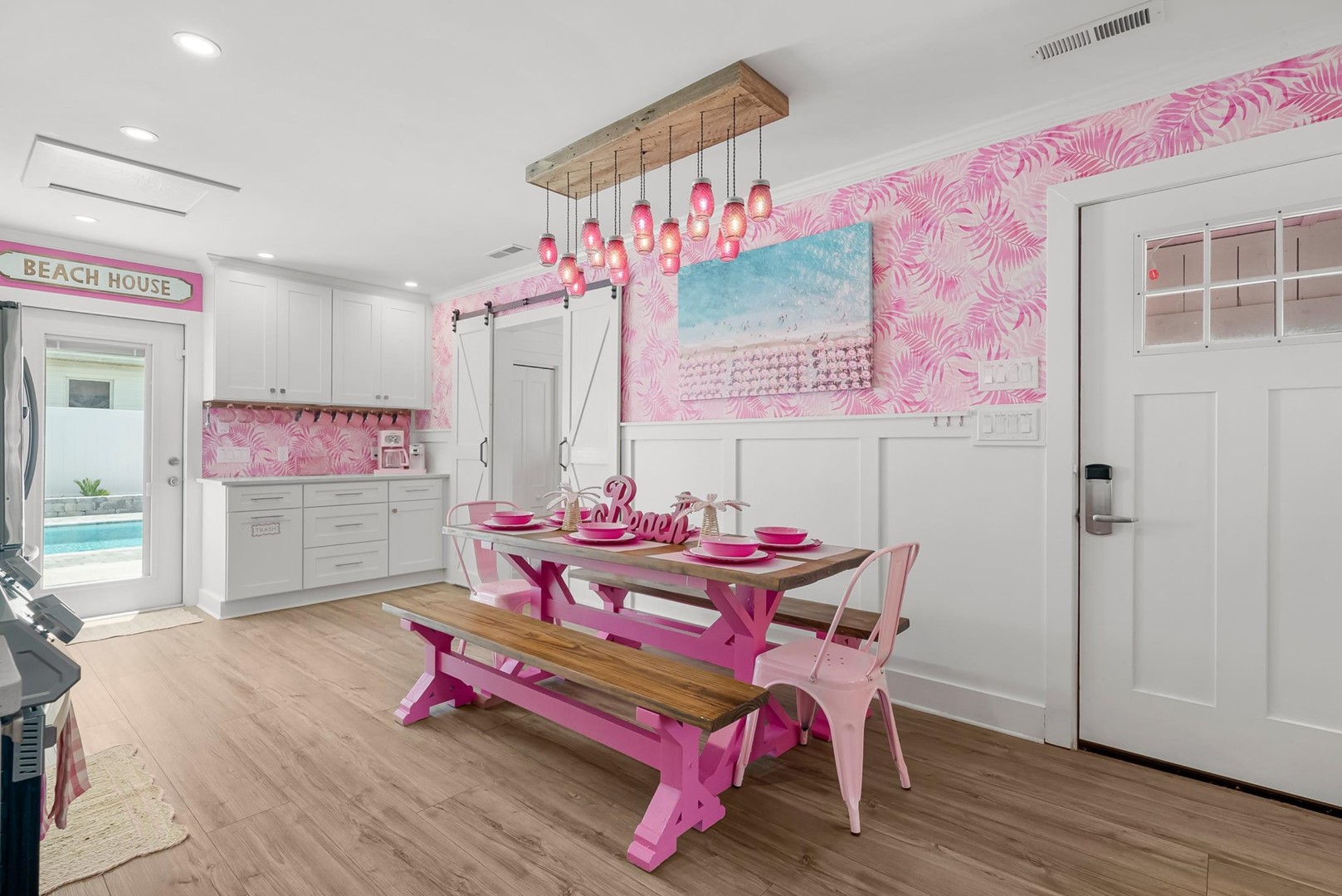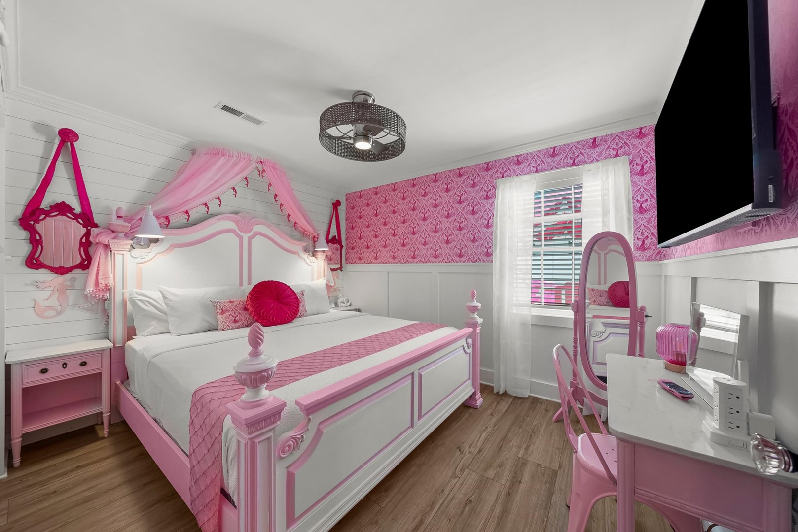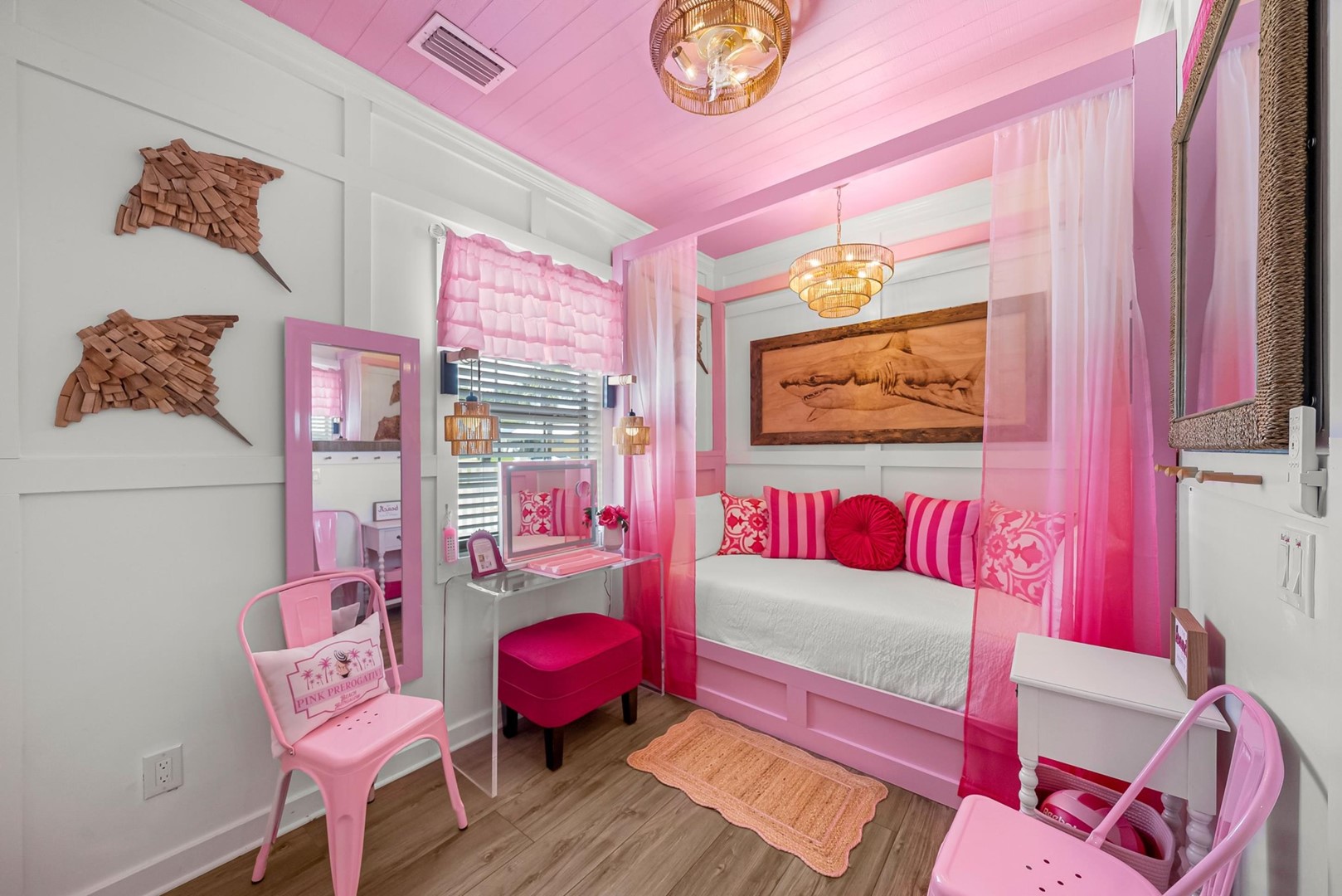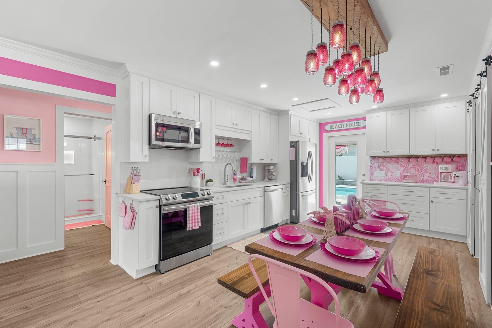 Inside, every corner is a statement of joy and creativity. The fully stocked kitchen features pink cookware, a pink KitchenAid mixer, and everything you need to whip up meals or sweet treats. Each bedroom includes a makeup vanity, luxe bedding, and playful themes that make every guest feel special.