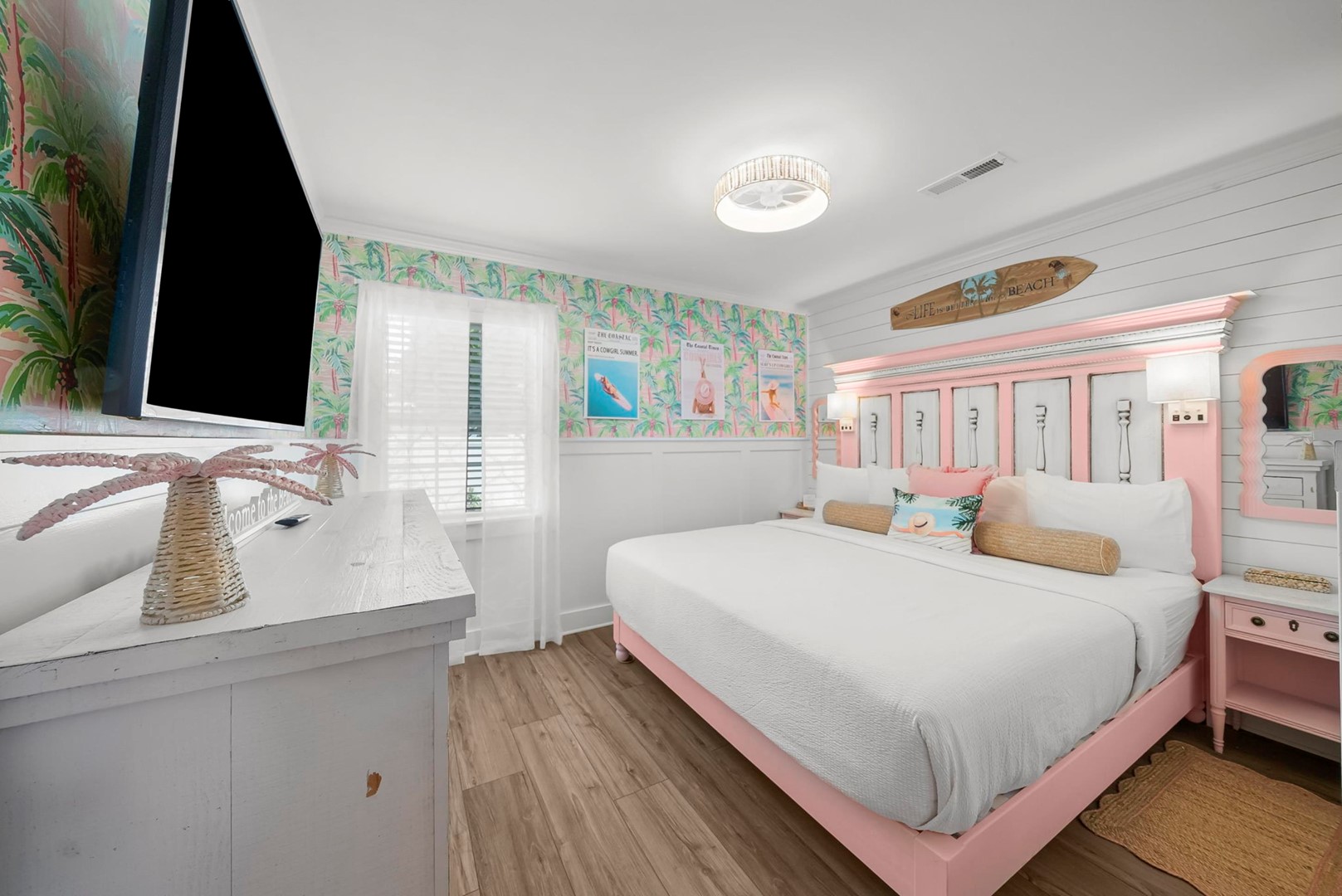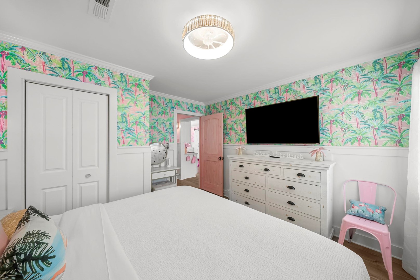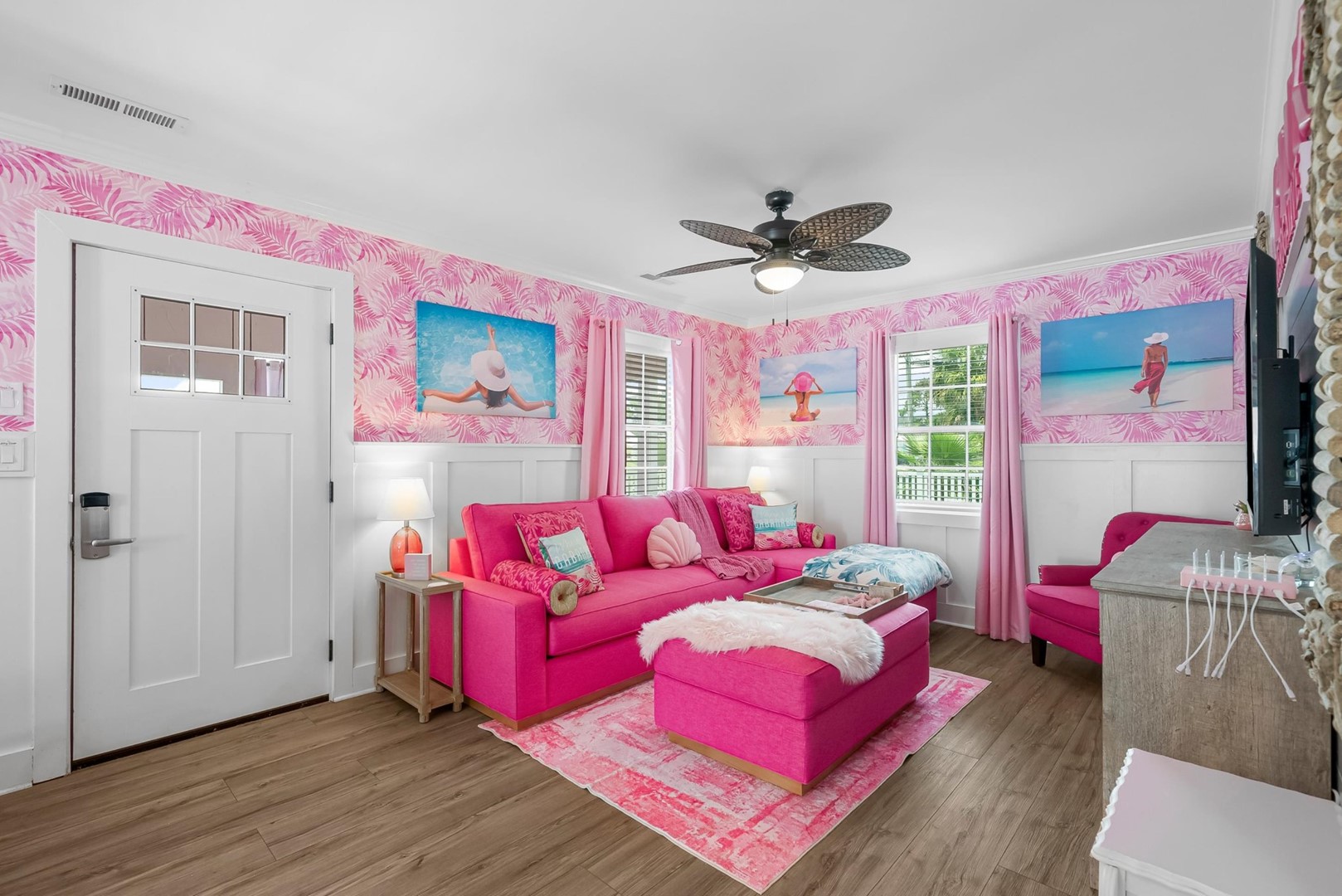 Inside, every corner is a statement of joy and creativity. The fully stocked kitchen features pink cookware, a pink KitchenAid mixer, and everything you need to whip up meals or sweet treats. Each bedroom includes a makeup vanity, luxe bedding, and playful themes that make every guest feel special.