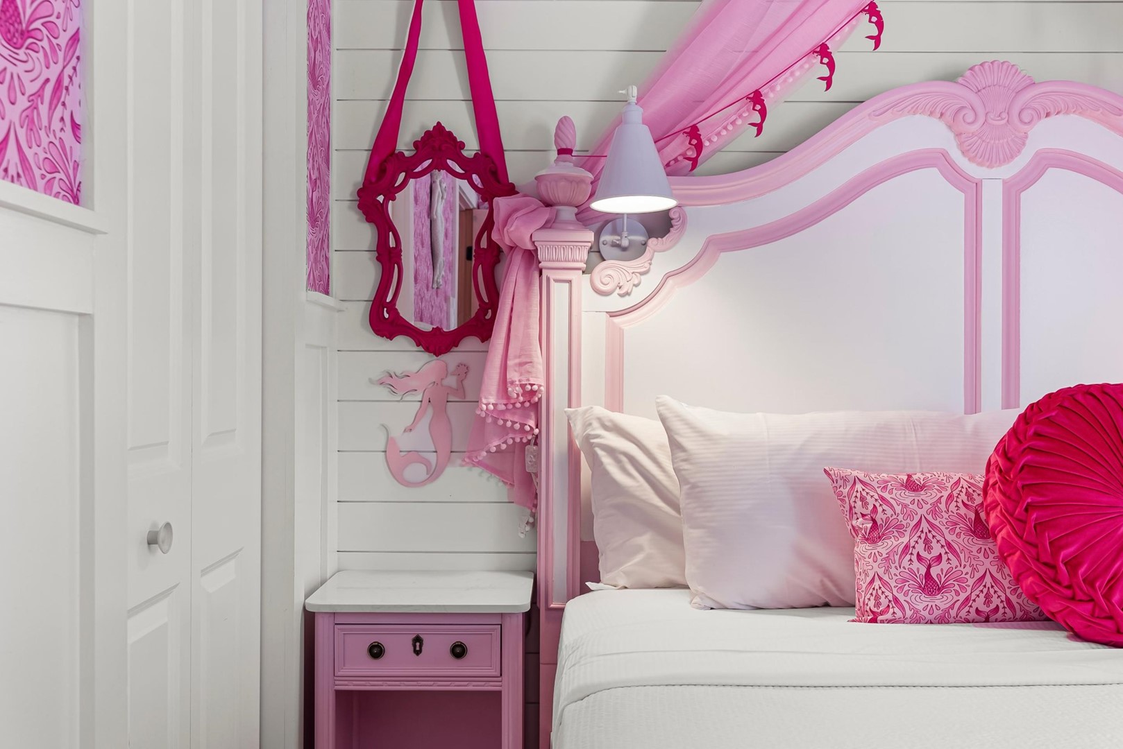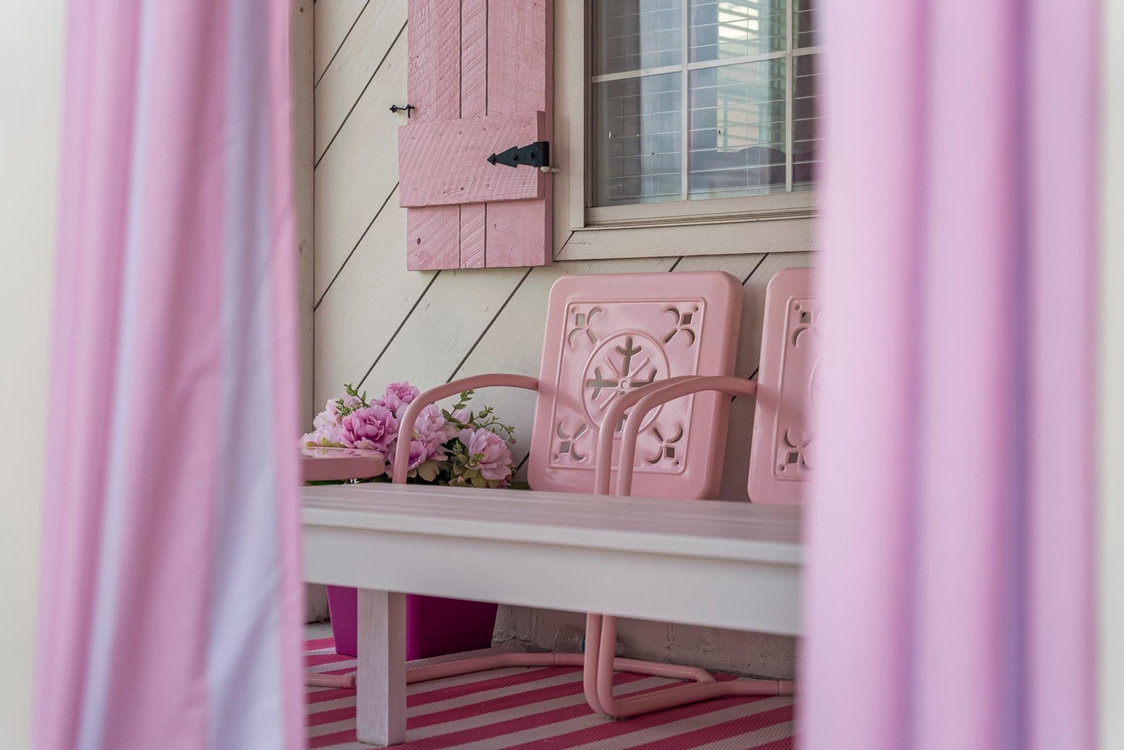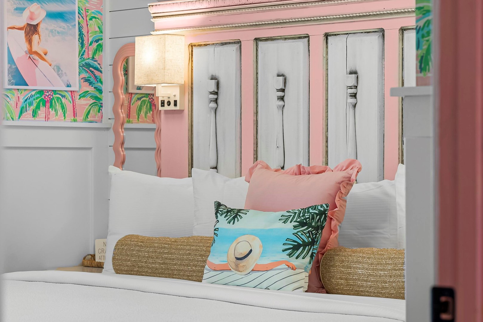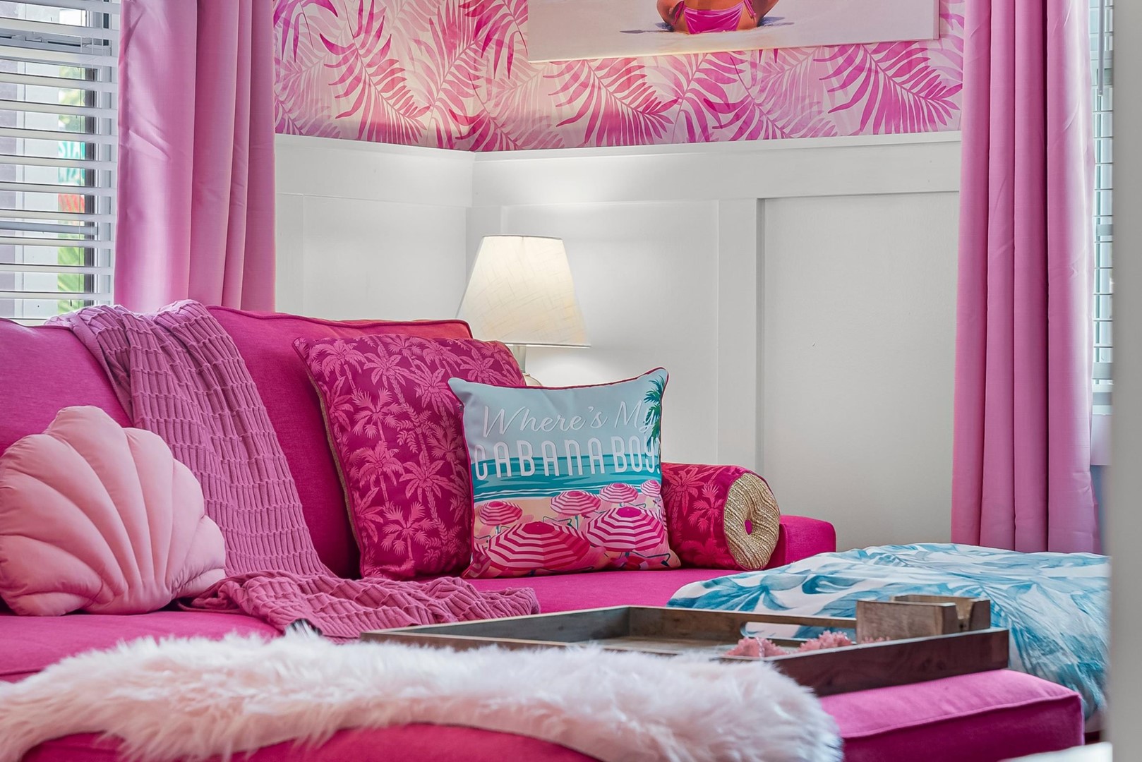 Inside, every corner is a statement of joy and creativity. The fully stocked kitchen features pink cookware, a pink KitchenAid mixer, and everything you need to whip up meals or sweet treats. Each bedroom includes a makeup vanity, luxe bedding, and playful themes that make every guest feel special.
