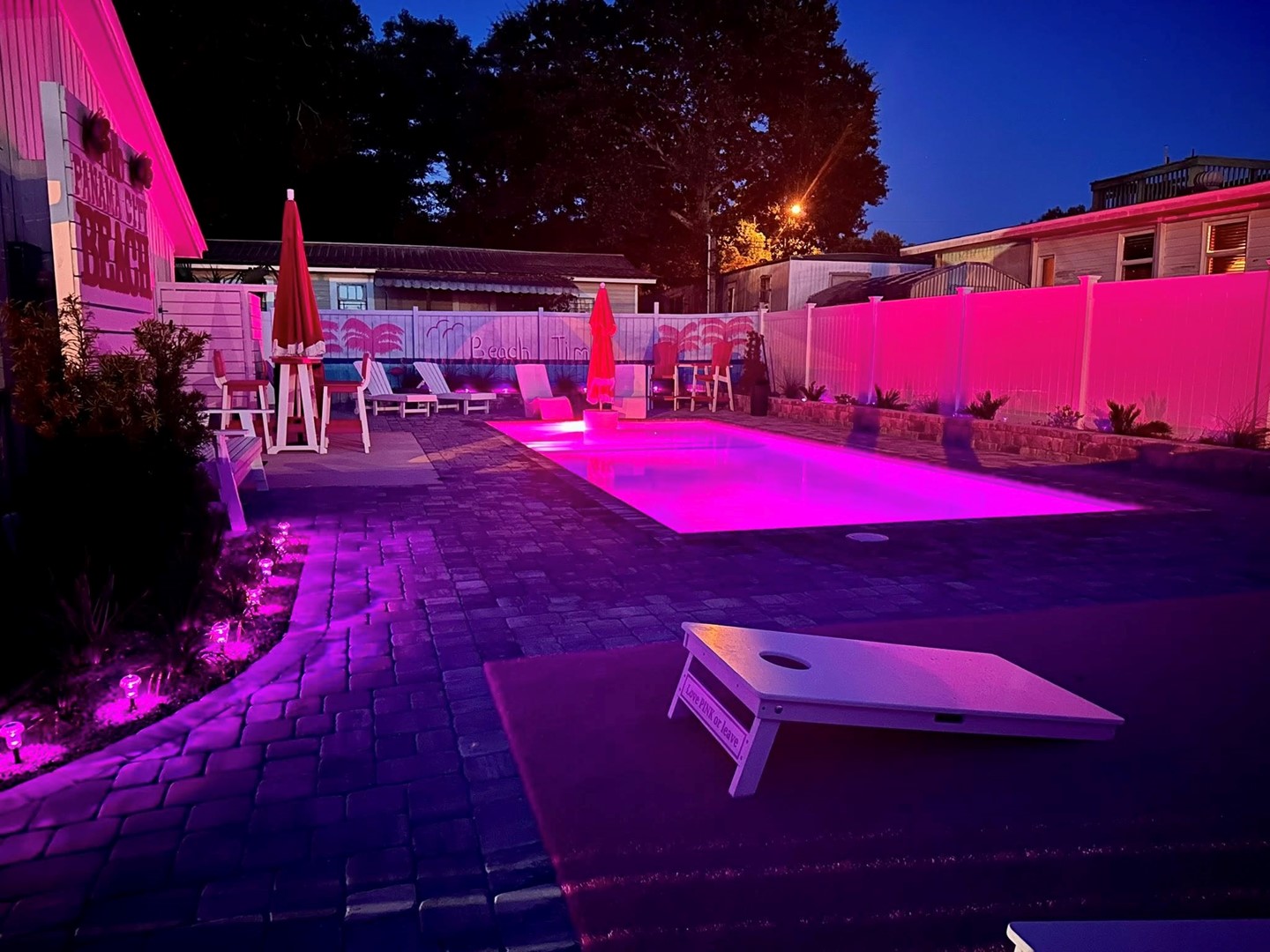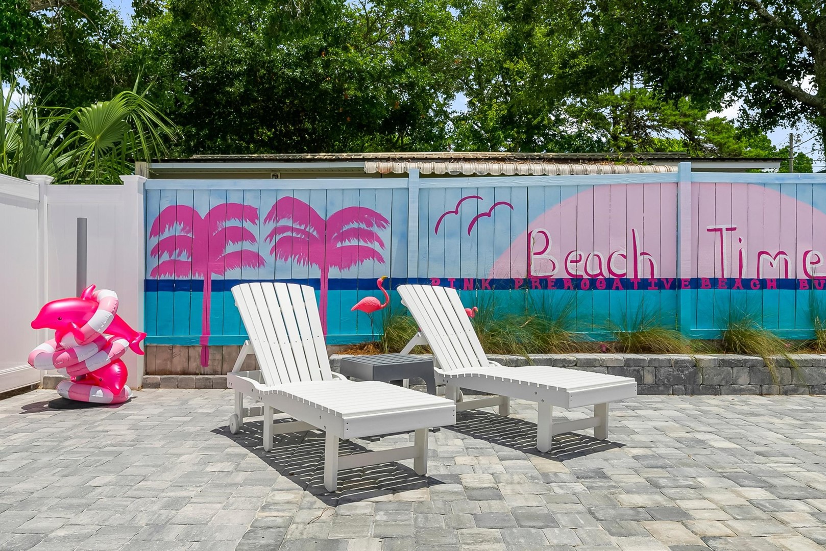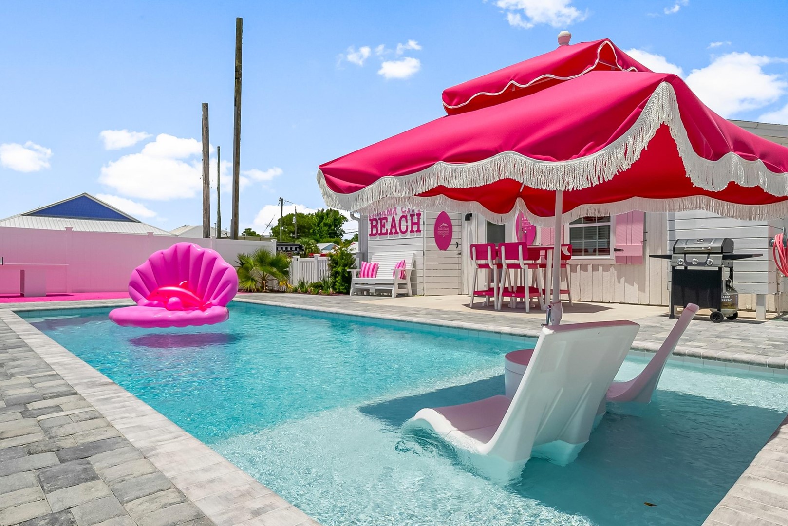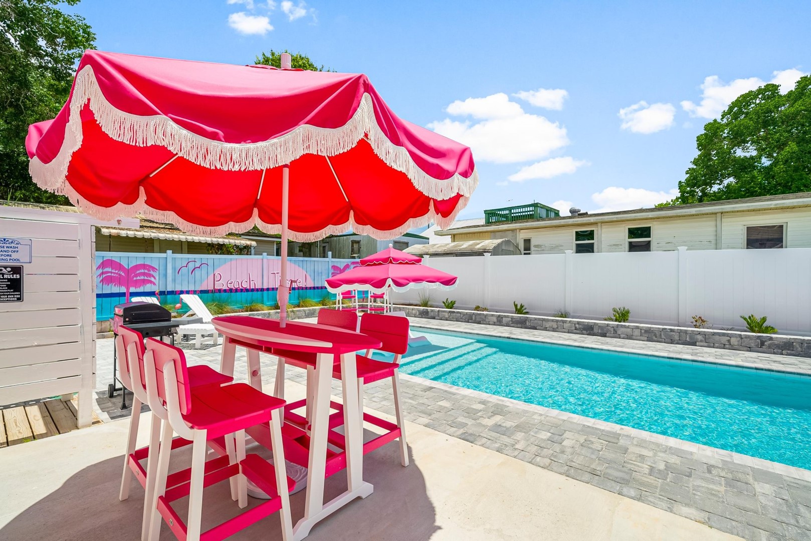 Whether you’re celebrating a bachelorette weekend, girls’ getaway, or simply living out your pink dream, this home offers the perfect backdrop for laughter, connection, and coastal bliss. Lounge by the private pool, play ping pong or cornhole on the pink turf, or enjoy an evening cocktail beneath twinkling tiki lights.