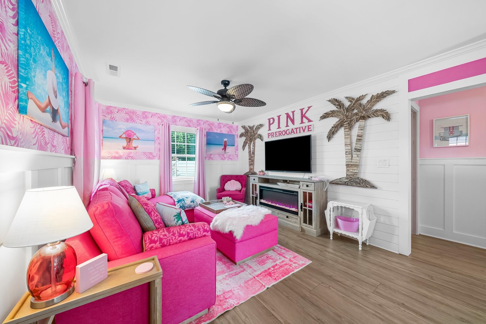 • Living area with 60" Smart TV and pink fireplace feature