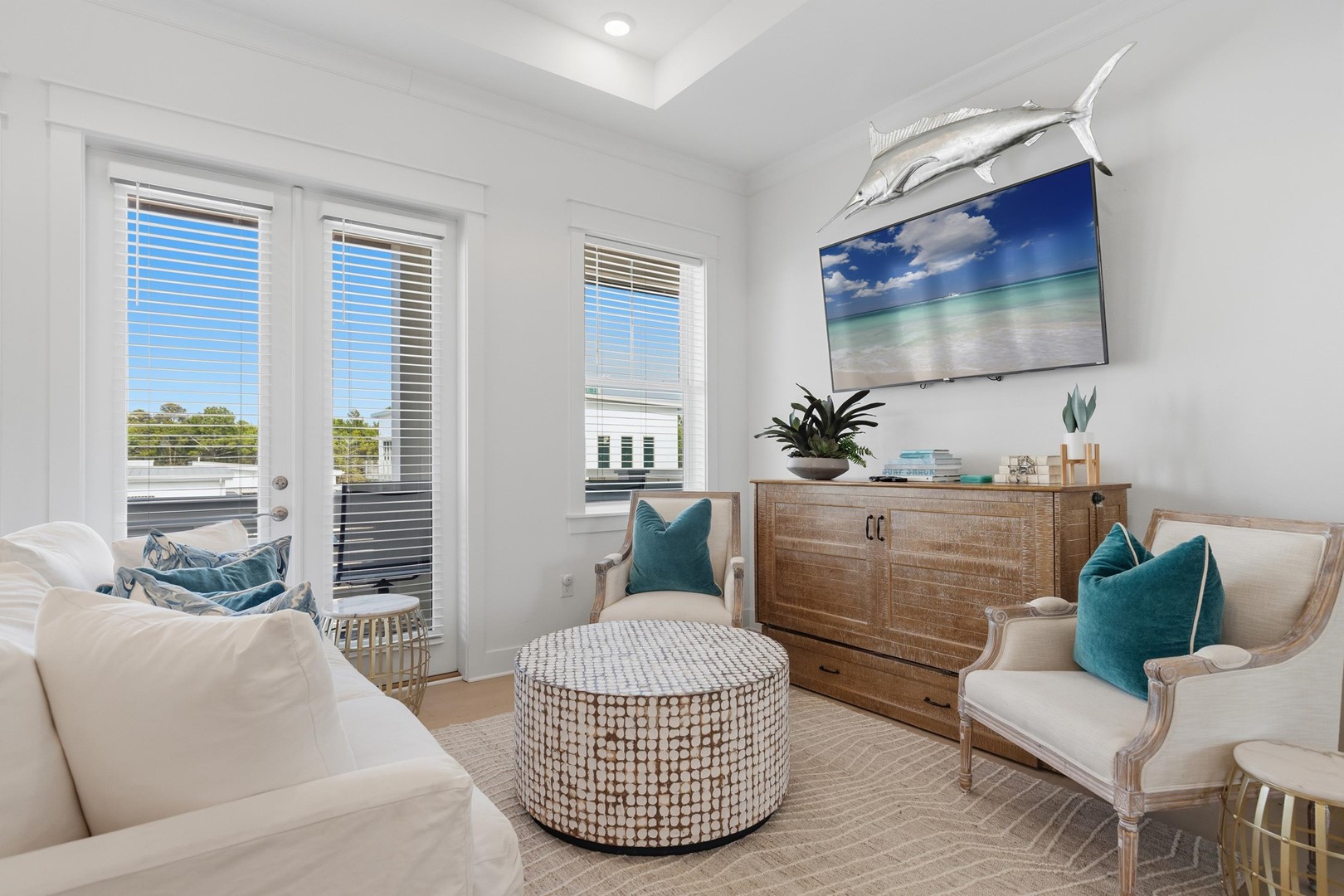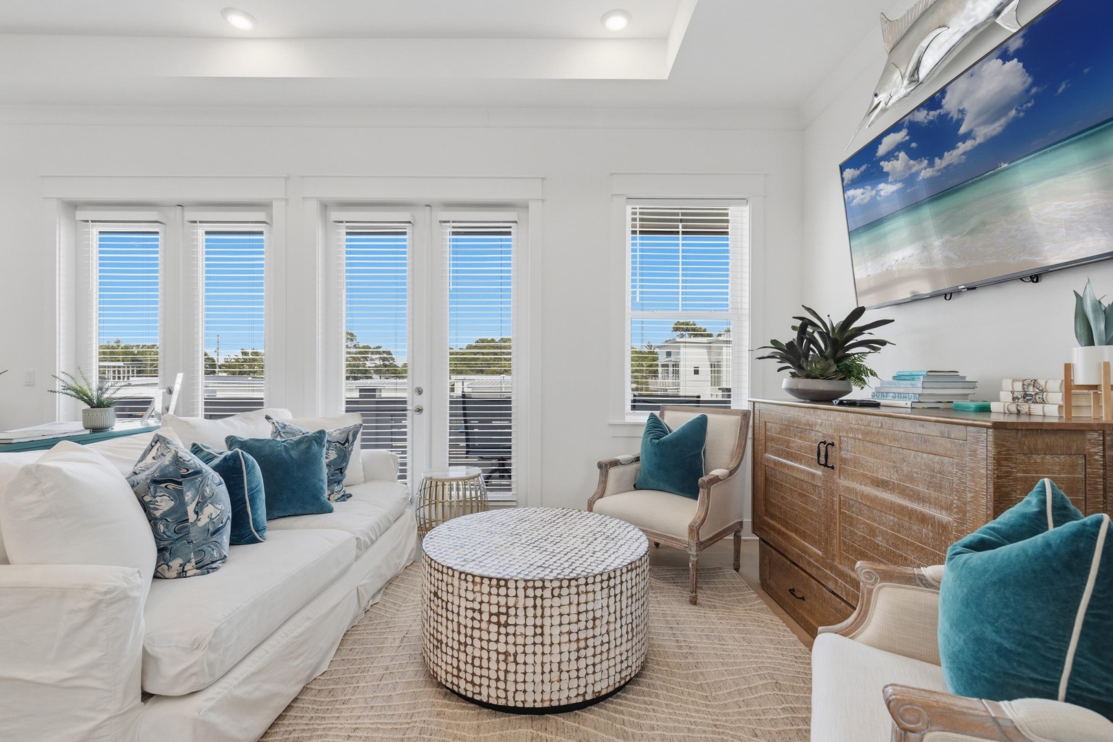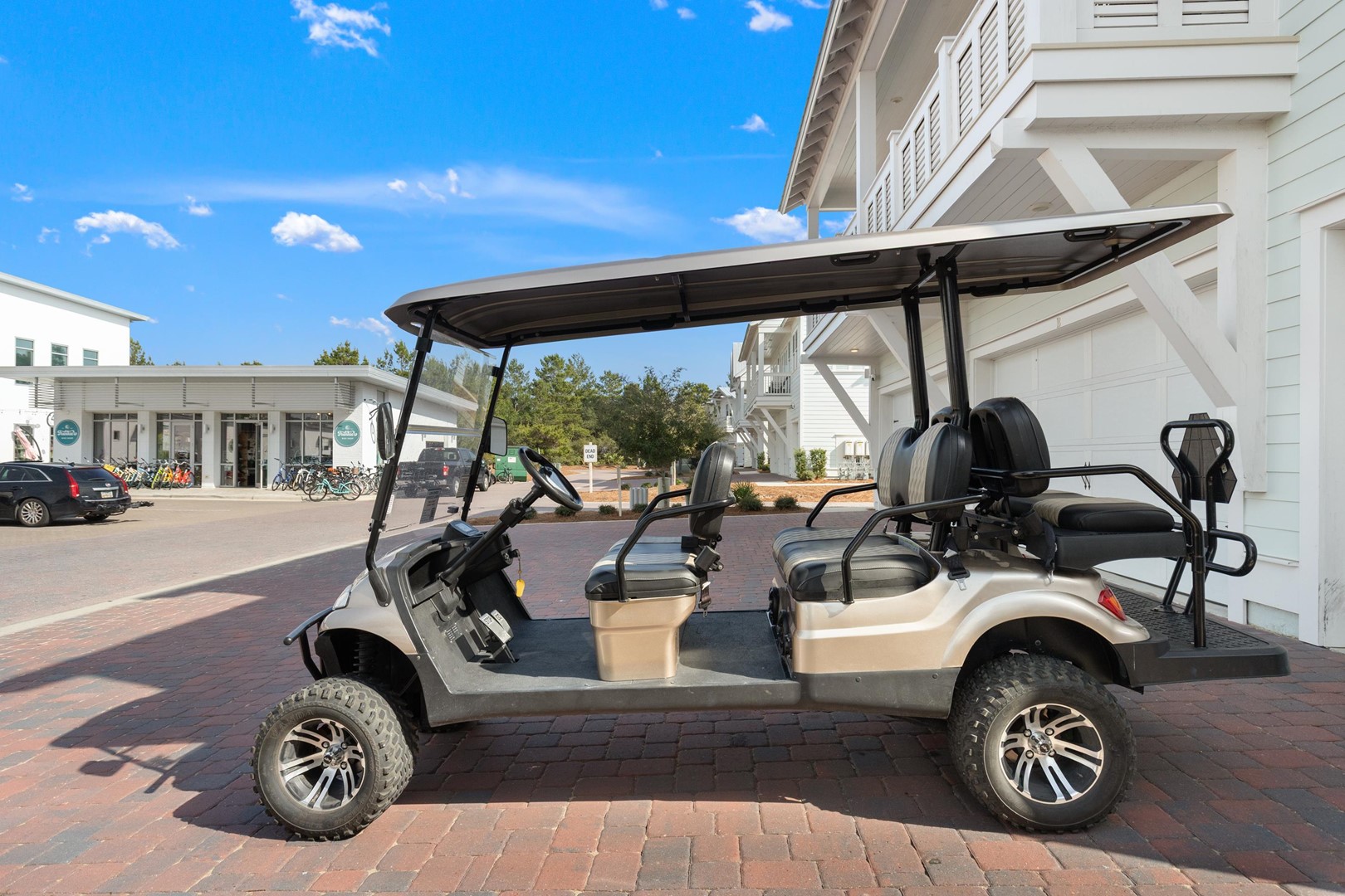 Prominence 30A rental, Emerald Waves, located in Watersound, FL by Panhandle Getaways is a 2 bedroom, 2 bathroom vacation home complete with all of the conveniences of home. 6 Seater Golf Cart Included! Family and Kid Friendly, walk to shops at The Big Chill right out the front door. This home is one of only five units like it on the south side of 30A right at the Big Chill.