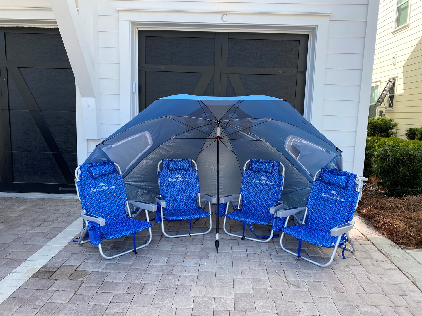 • Beach cart, four Tommy Bahama chairs, Sunbrella umbrella, and rolling cooler