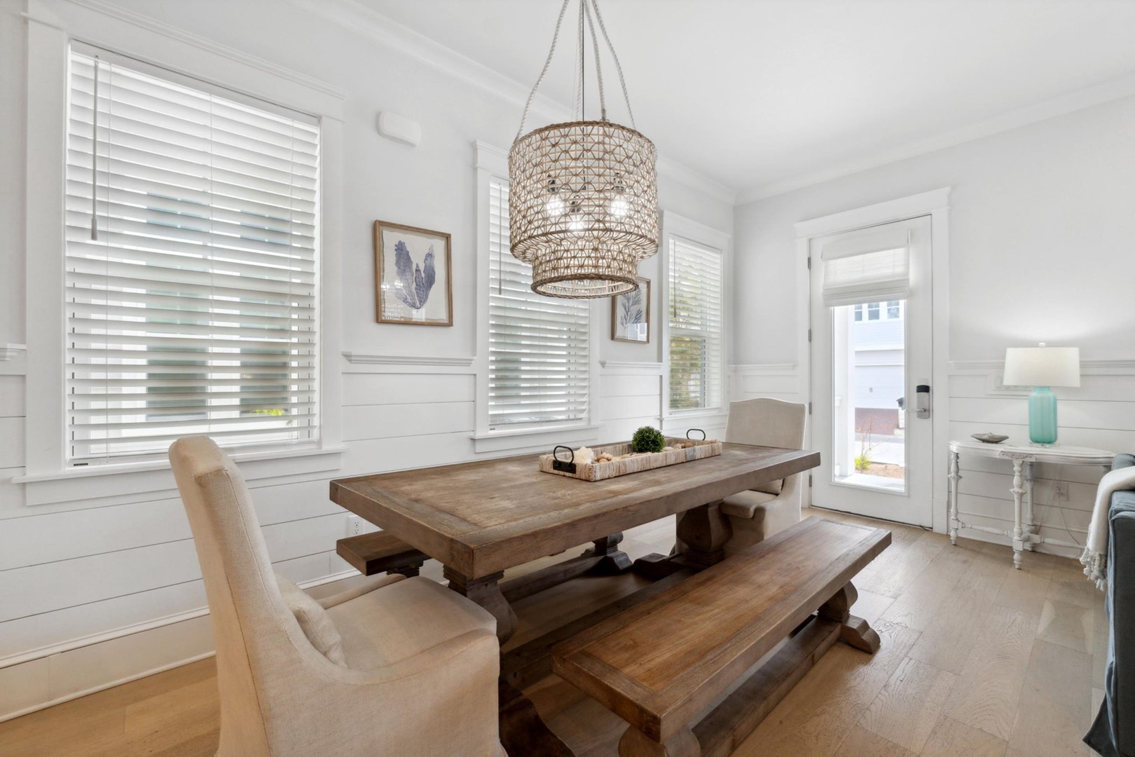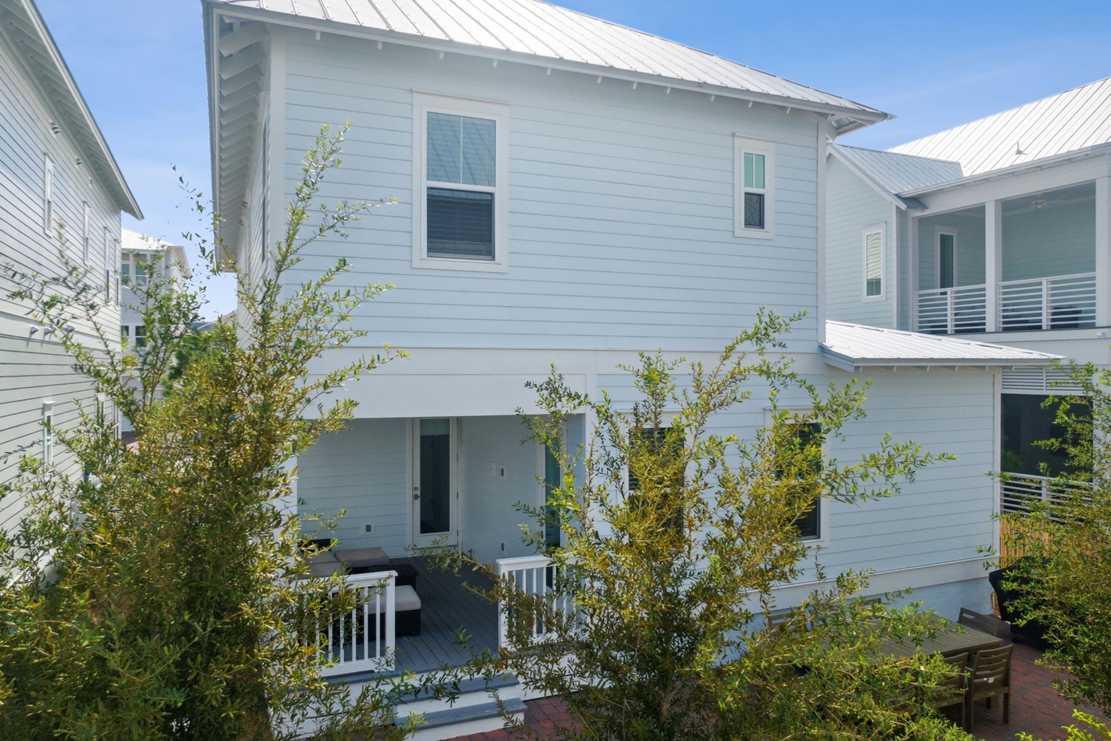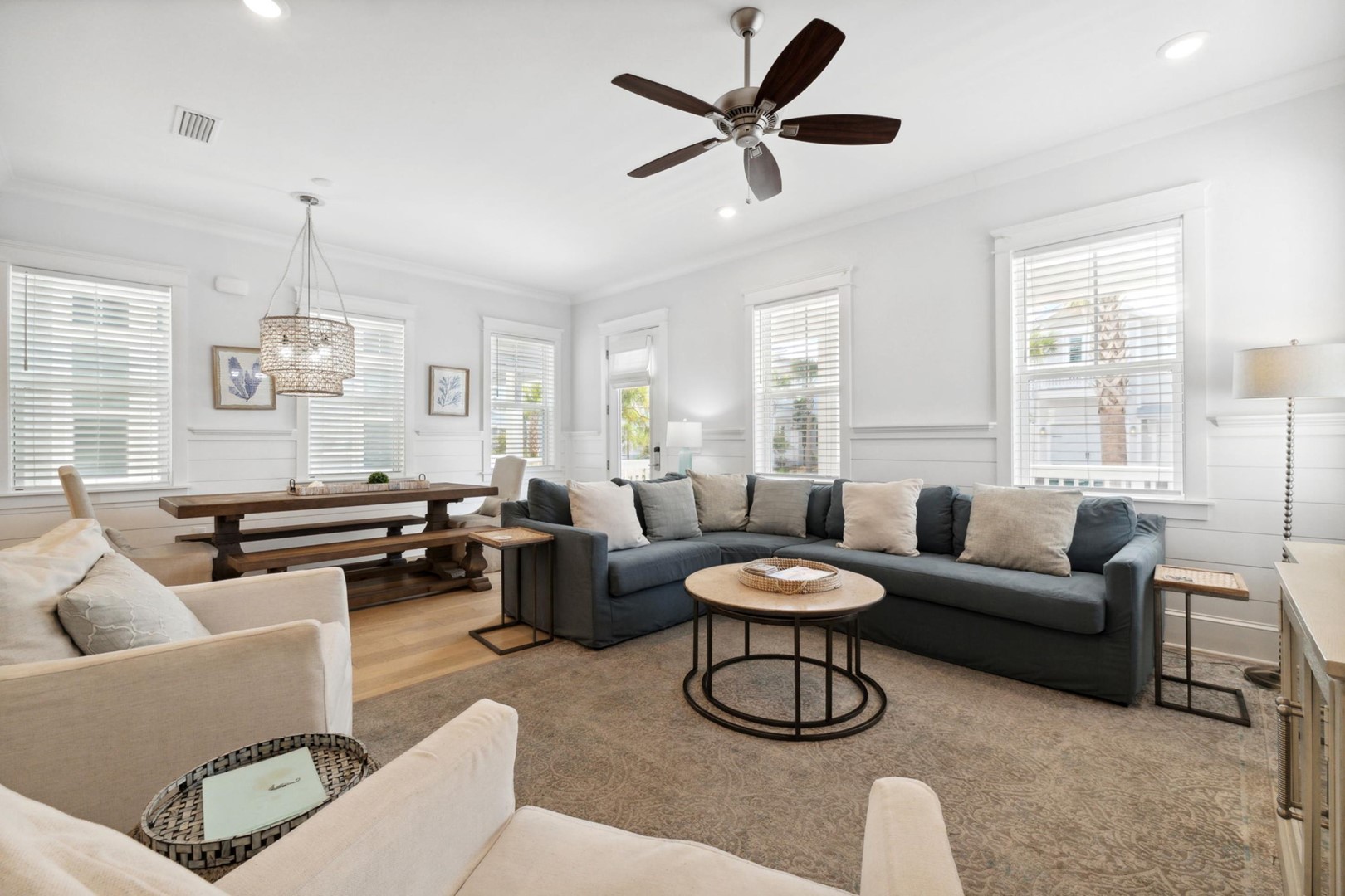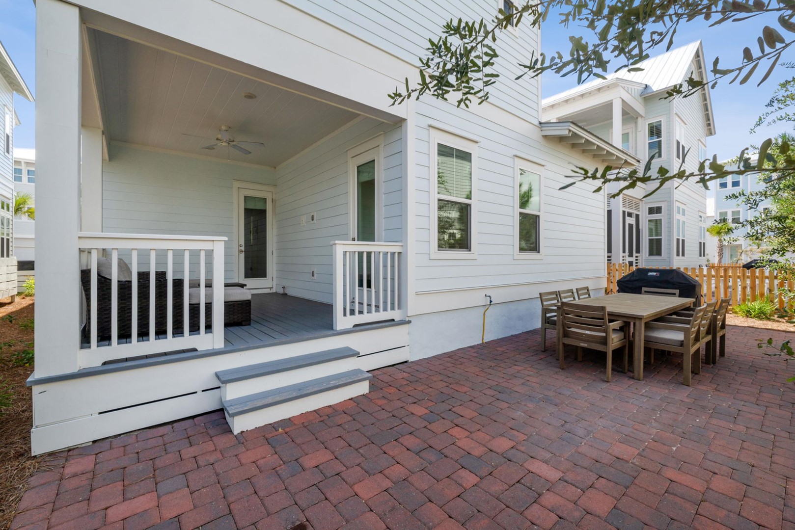 As you step into Sugar Magnolia, guests will take note of the open environment with 10-foot ceilings and coastal style throughout the home, including a first floor master suite with private access to the back patio. The dining table can seat 10 andthere are 4 extra seats at the kitchen island. In the back of the home you will find a covered deck with sectional and an expanded paver patio with outdoorteak dining table for 8, plus a Weber grill!