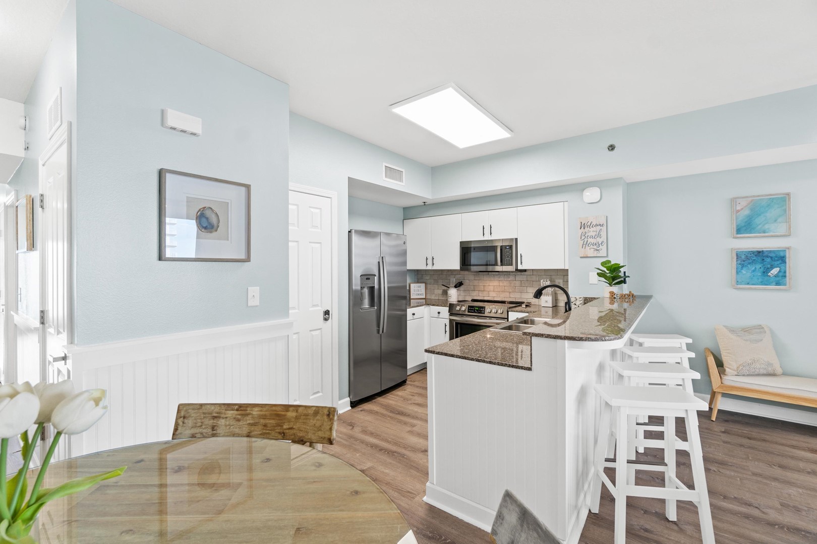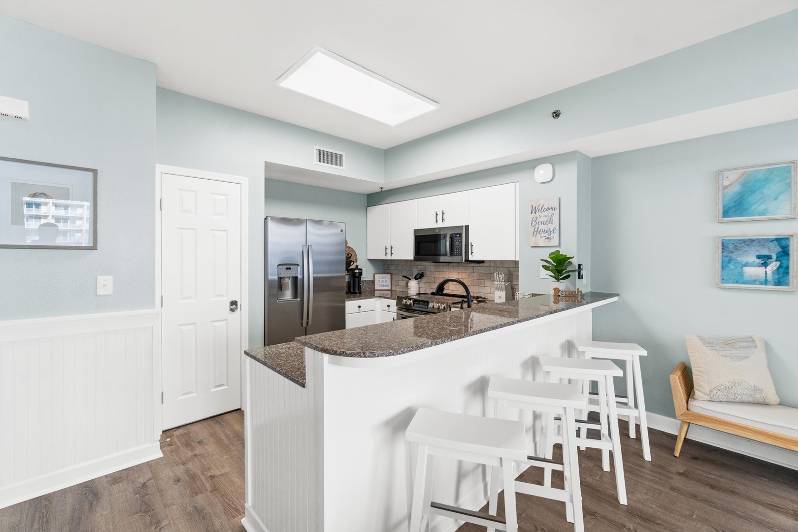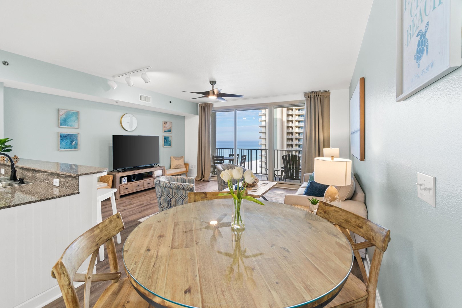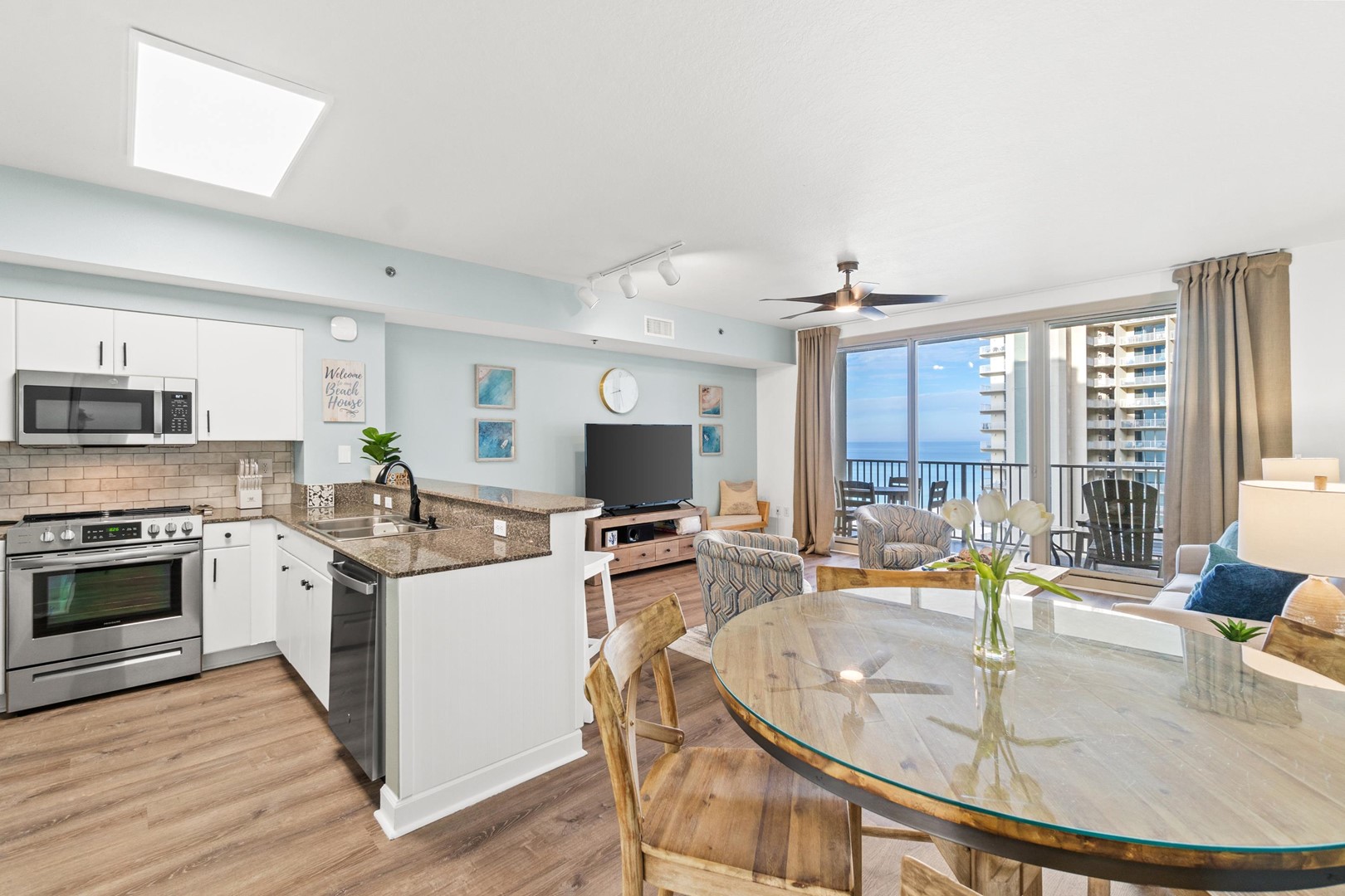 Everything you need is here for you. A fully equipped granite countertop white kitchen with seating for 4 at the kitchen bar and additional seating at the dining table nearby. Relax and enjoy some quality time with friends and family, playing games in the living room, watching movies in the 70” size flat screen TV or just relax and read a book while enjoying the ocean views and listening to the sound of the waves. The fully furnished balcony with outdoor seating and dining table is perfect to watch the breathtaking sunsets, while enjoying your cocktails before heading out to one of the many nearby restaurants in the area.