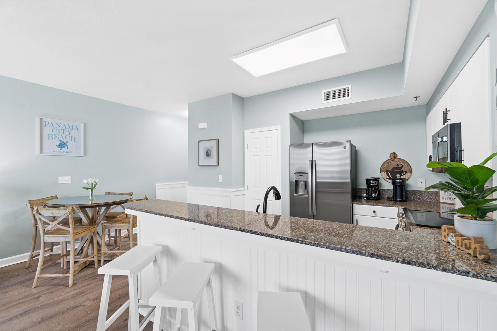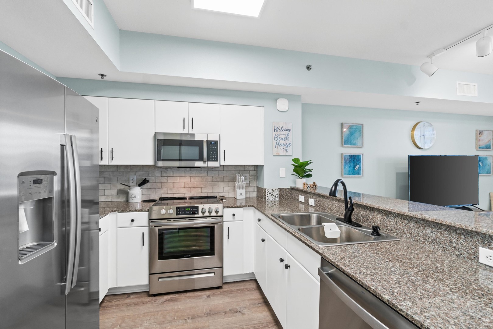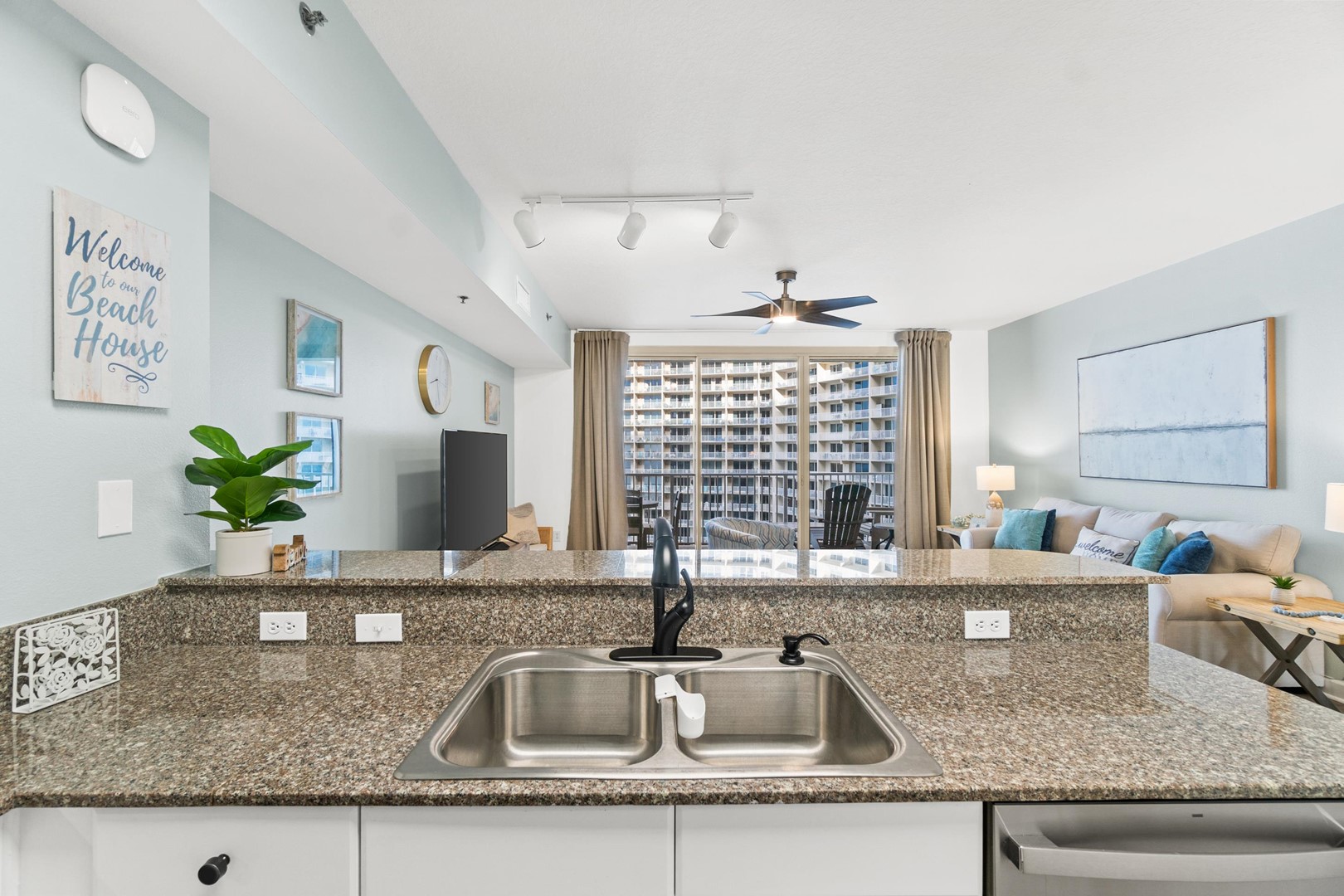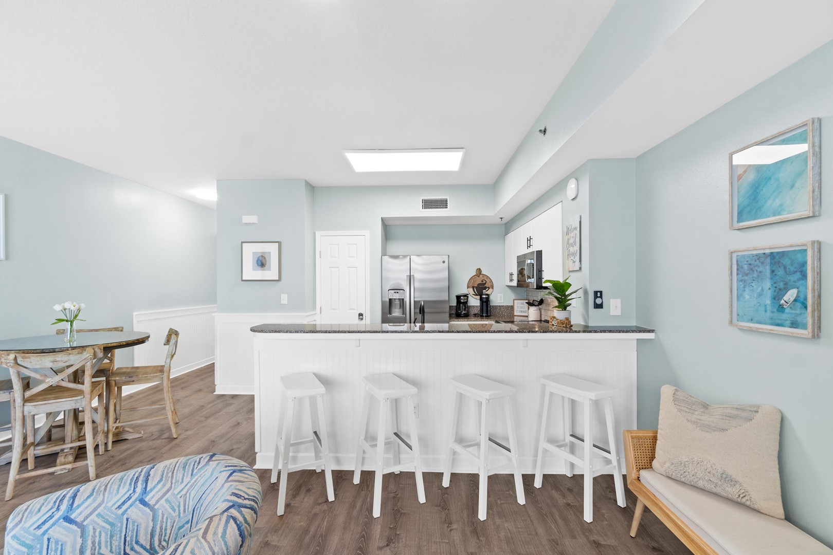 Everything you need is here for you. A fully equipped granite countertop white kitchen with seating for 4 at the kitchen bar and additional seating at the dining table nearby. Relax and enjoy some quality time with friends and family, playing games in the living room, watching movies in the 70” size flat screen TV or just relax and read a book while enjoying the ocean views and listening to the sound of the waves. The fully furnished balcony with outdoor seating and dining table is perfect to watch the breathtaking sunsets, while enjoying your cocktails before heading out to one of the many nearby restaurants in the area.