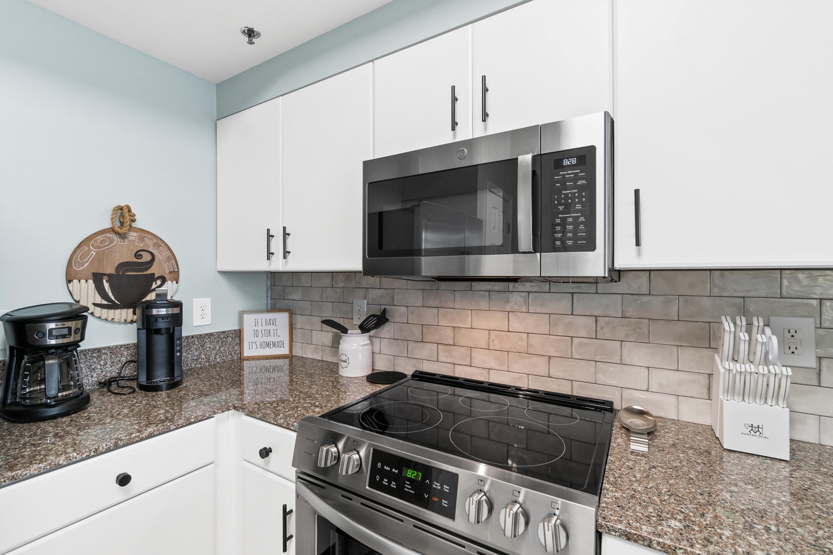 included in the kitchen: toaster, blender, hand mixer, Keurig type and drip coffee maker,