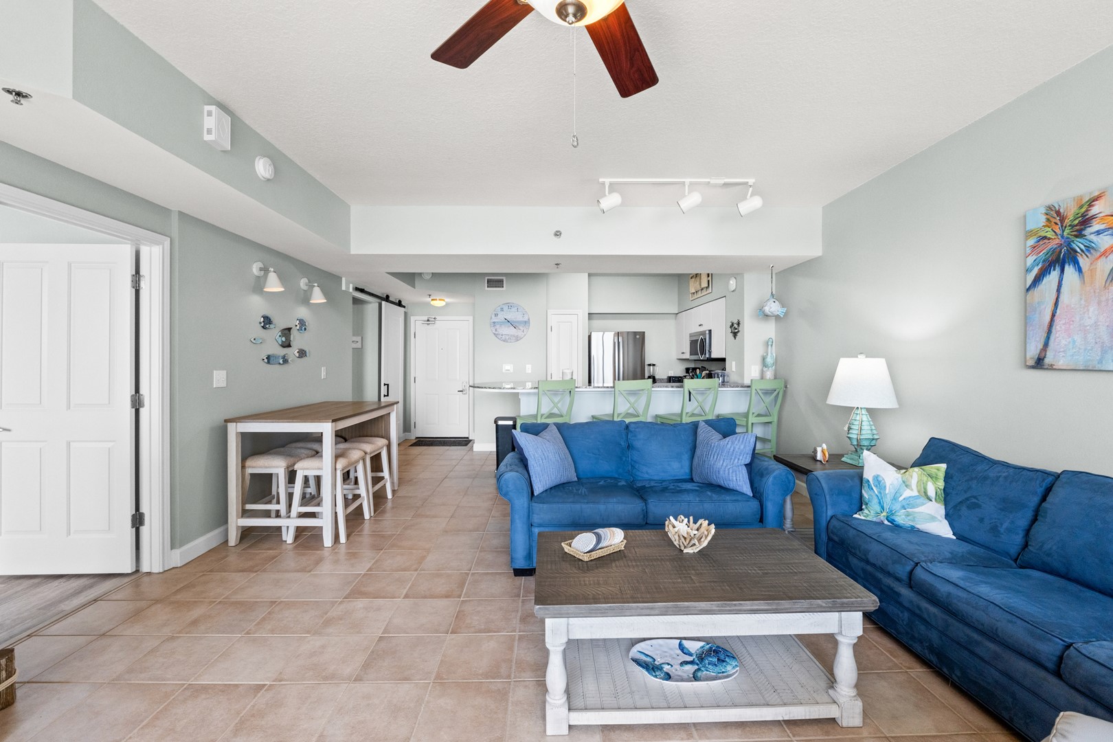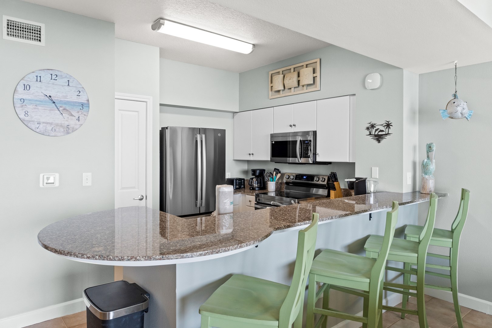 A fully equipped granite counter top kitchen with seating for 4 at the kitchen bar and seating for 4 at the dining table. Relax and enjoy some quality family time, playing games in the living room, watching movies on the new 65” flat screen TV, or just relax and read a book while enjoying the ocean views. The newly furnished balcony with outdoor seating and dining table is perfect to watch the playful dolphins in the gulf while enjoying your cocktails.