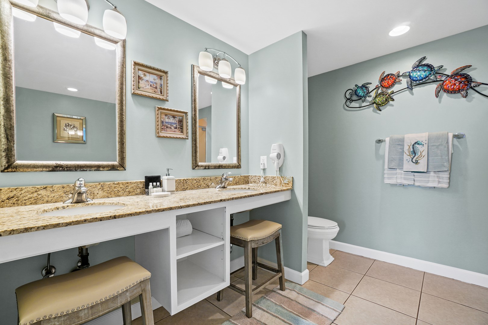 Perfect for larger families or couples traveling together, the condo features a full kitchen and two private suites and a guest bedroom. One of the suites is an efficiency lockout unit, complete with a mini-fridge, sink, microwave, and coffee maker for added convenience.