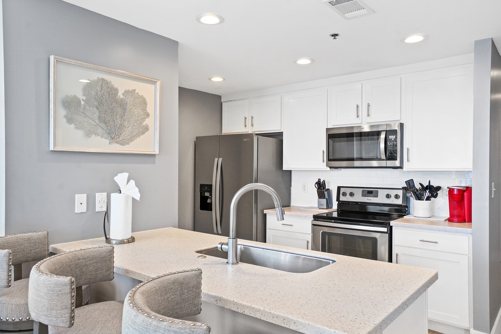 Perfect for larger families or couples traveling together, the condo features a full kitchen and two private suites and a guest bedroom. One of the suites is an efficiency lockout unit, complete with a mini-fridge, sink, microwave, and coffee maker for added convenience.