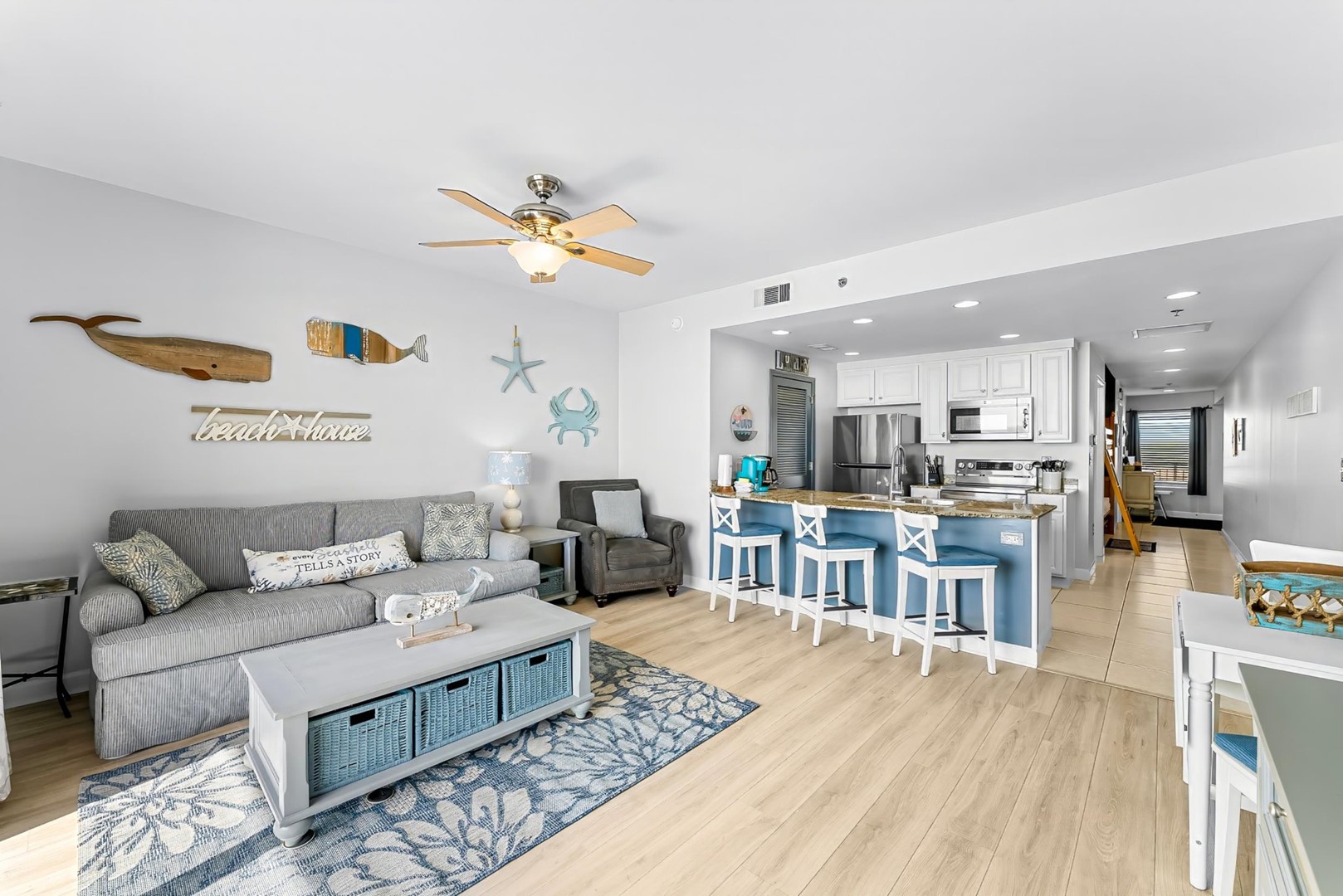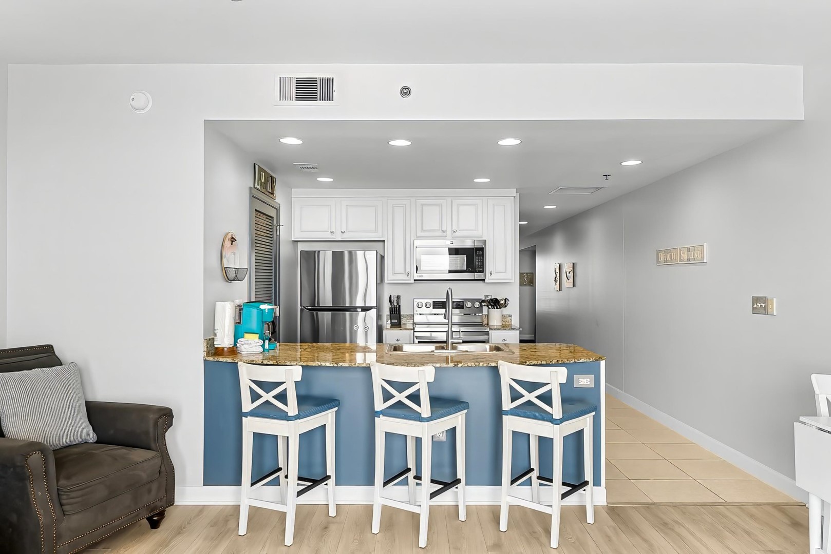 What sets this unit apart is location within the resort, storage, use of space, and functionality. It is ideally located on the sought-after 4th floor of the West tower, with easy access to the elevators that bring guests directly to the children’s water park and hot tub. It has extra space near the entrance door that allows for your beach gear and an extremely well-equipped kitchen and balcony. The condo is extremely functional, including both a Keurig and standard coffee maker, in-unit washer and dryer, adequate storage and lounging space for up to 6 guests, blow dryers, makeup mirrors, iron, ironing board, and additional pantry space for groceries.