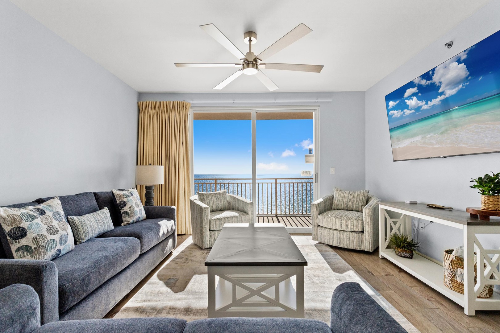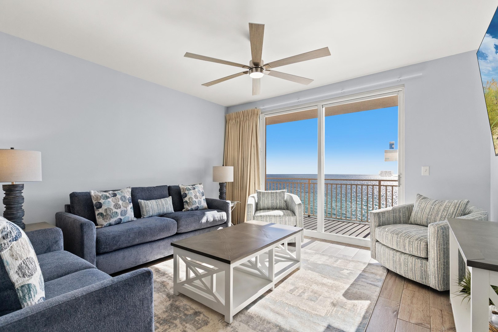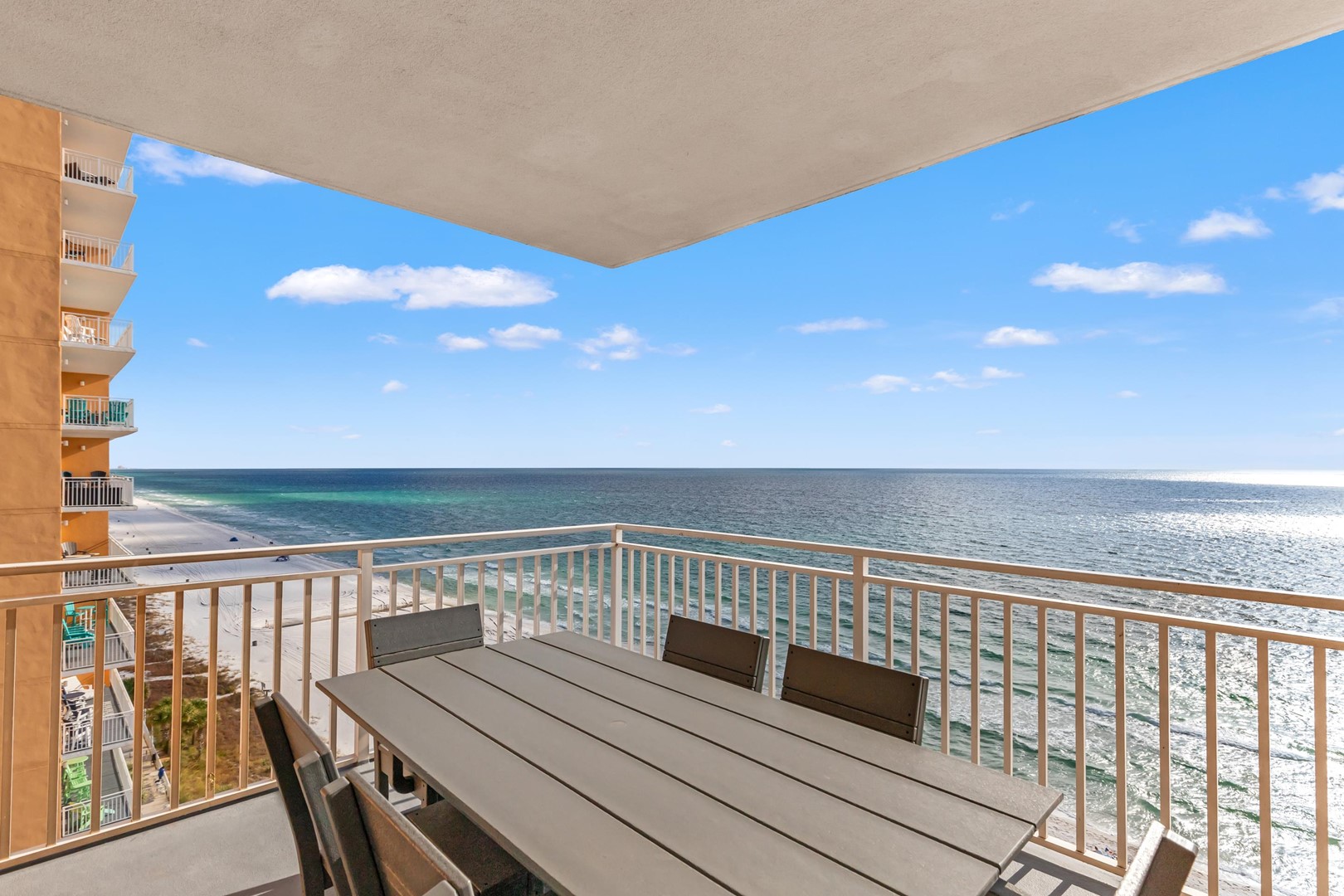Splash Beach Resort rental 807W in Panama City Beach, FL by Panhandle Getaways is a 2 bedroom plus bunk area, 2 bathroom vacation home complete with all of the conveniences of home. Guests will enjoy 2 gulf front primary bedrooms and incredible views from the direct beachfront extended corner balcony.