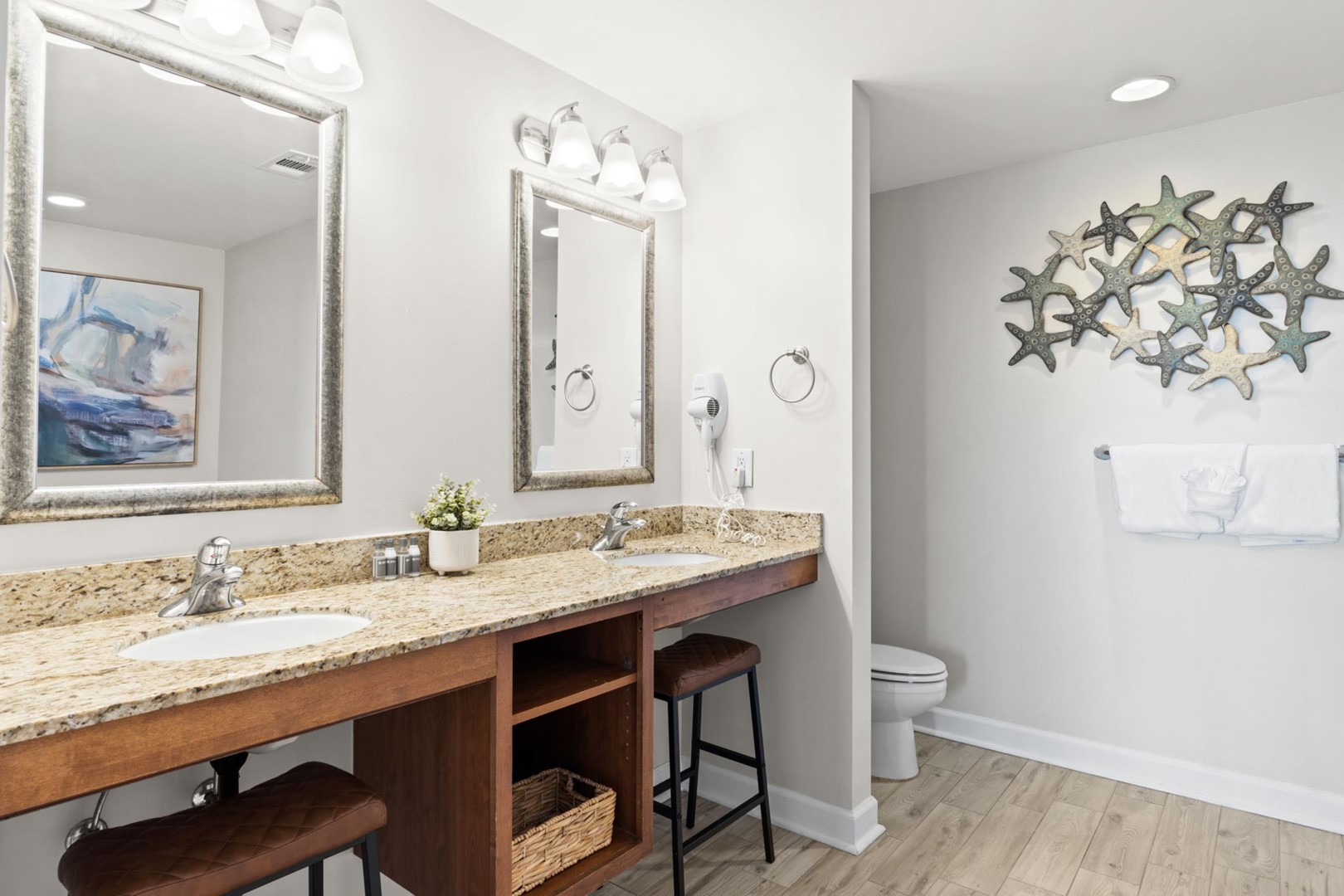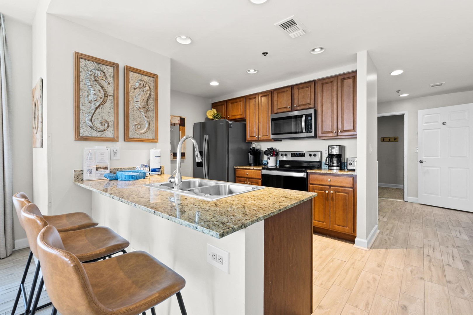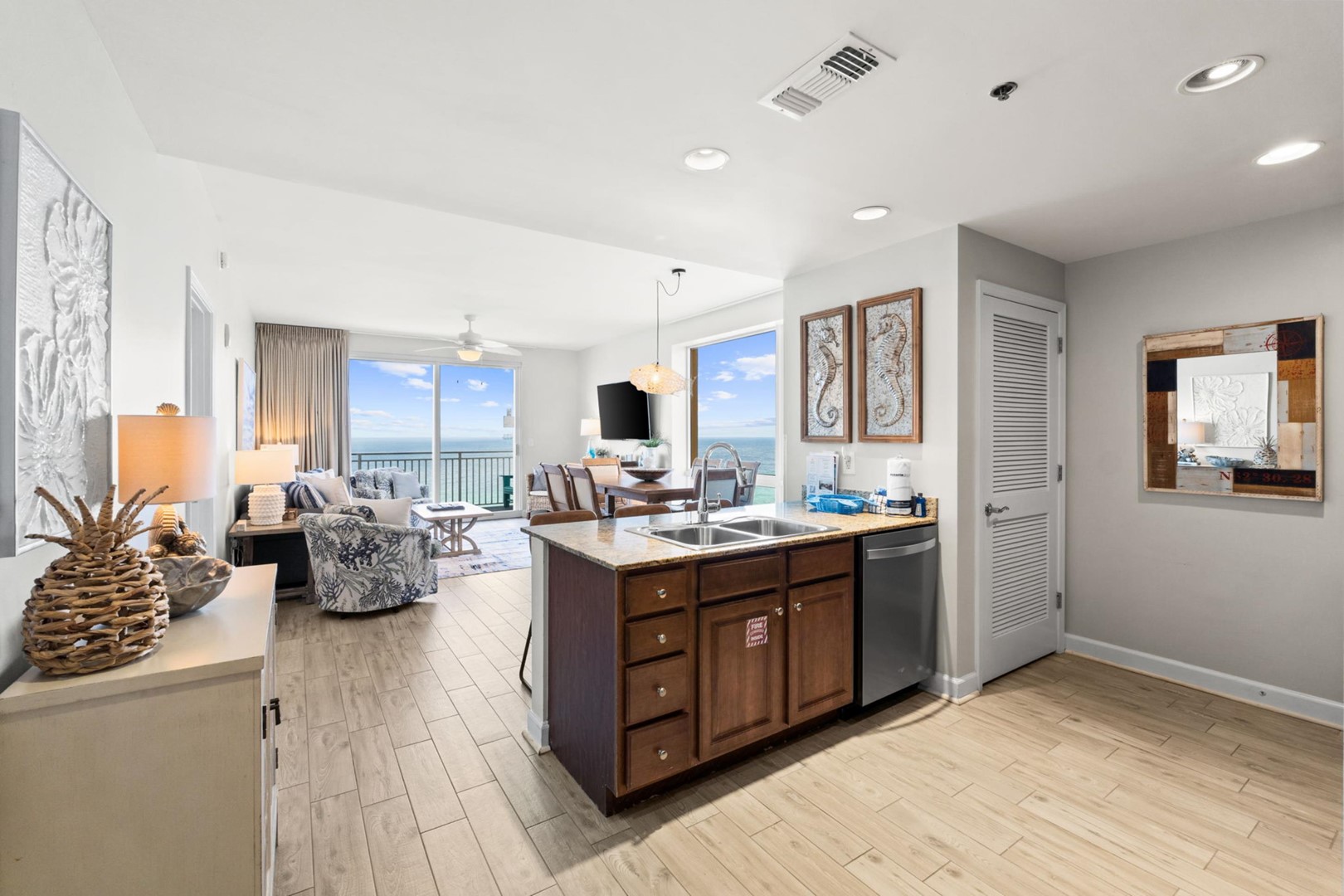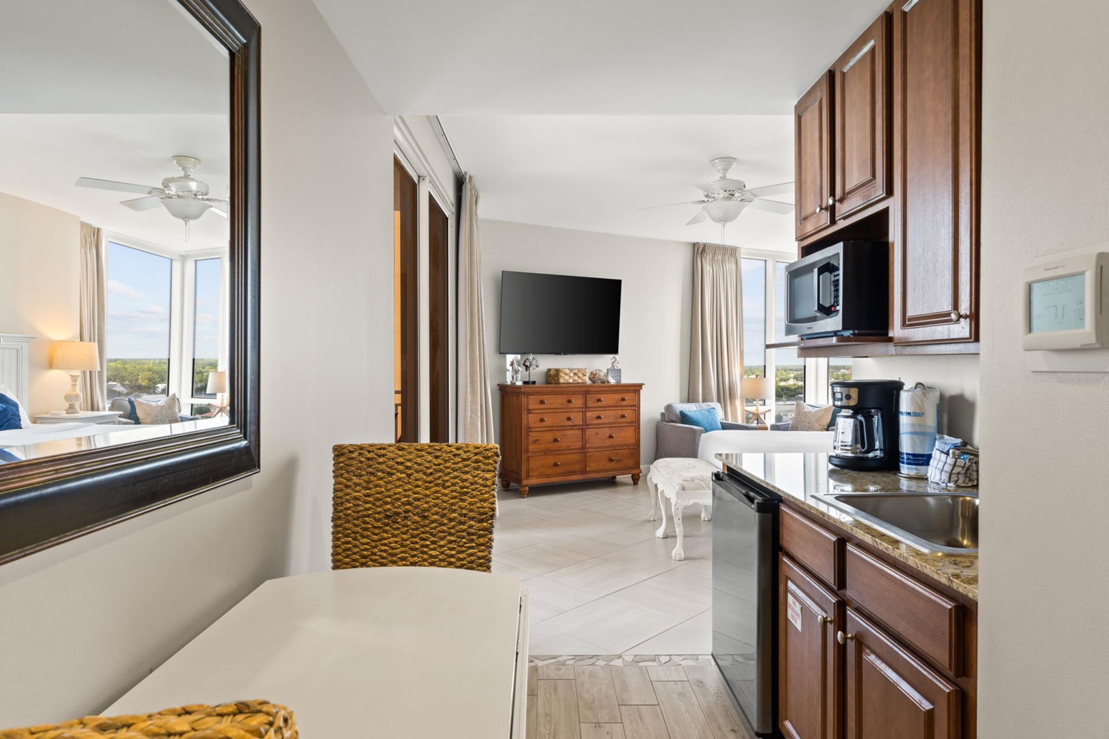 Perfect for larger families or couples traveling together, the condo features a full kitchen and two private suites and a guest bedroom. One of the suites is an efficiency lockout unit, complete with a mini-fridge, sink, microwave, and coffee maker for added convenience.