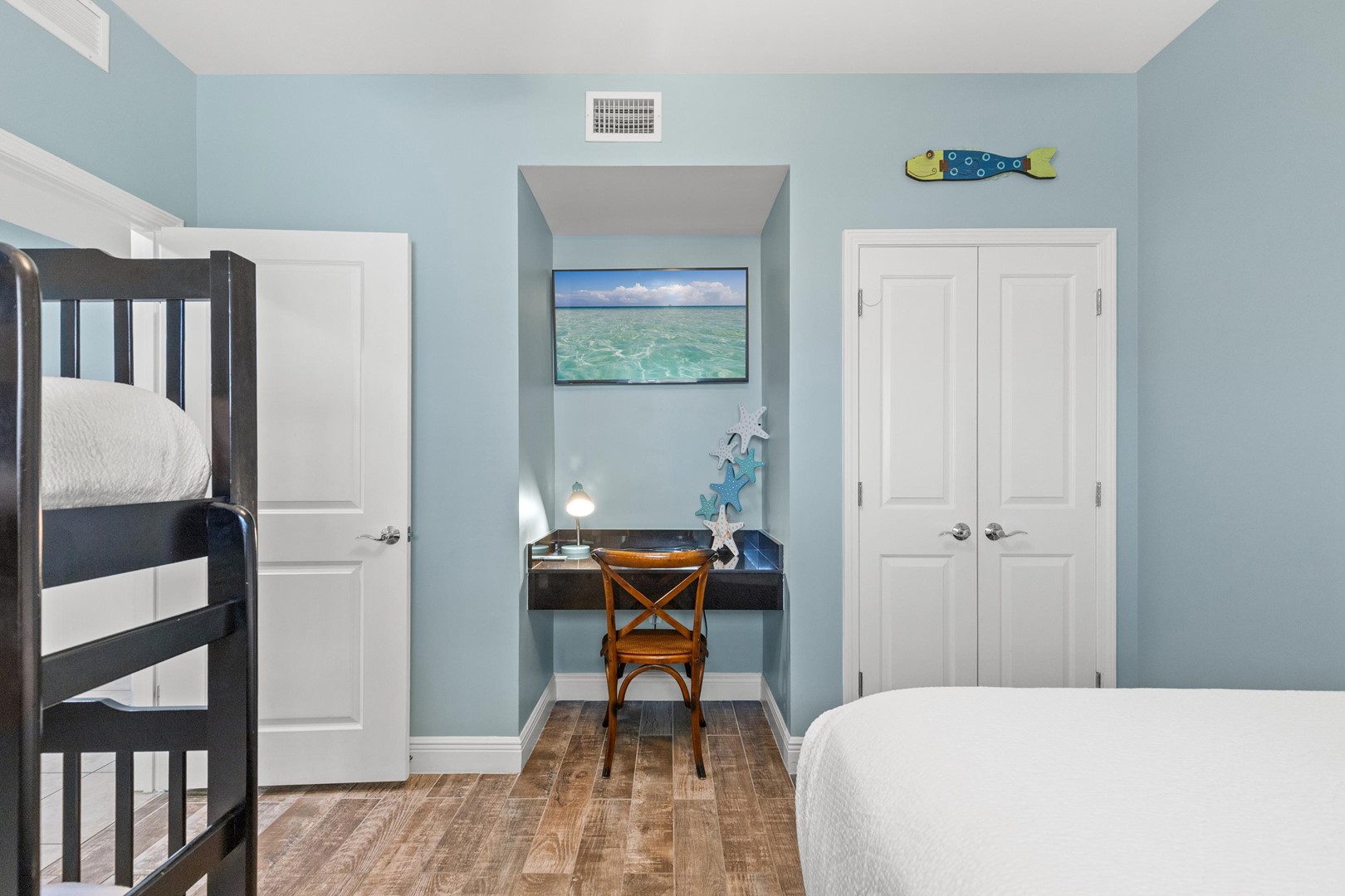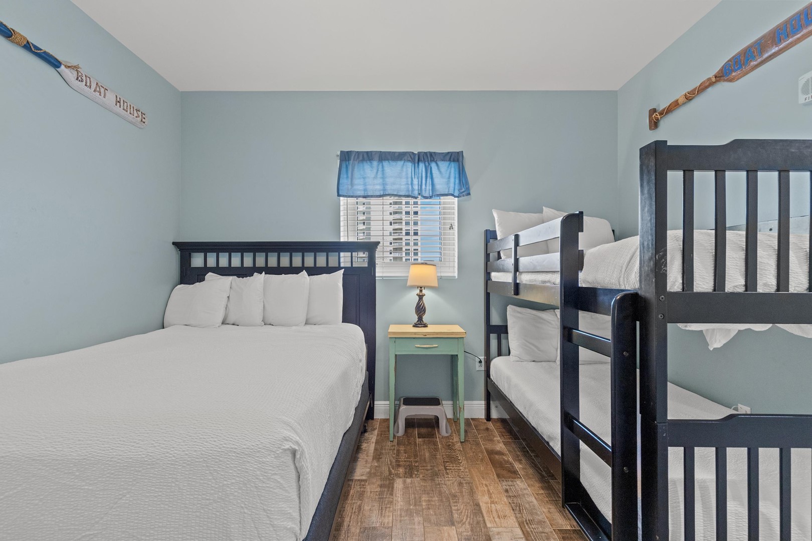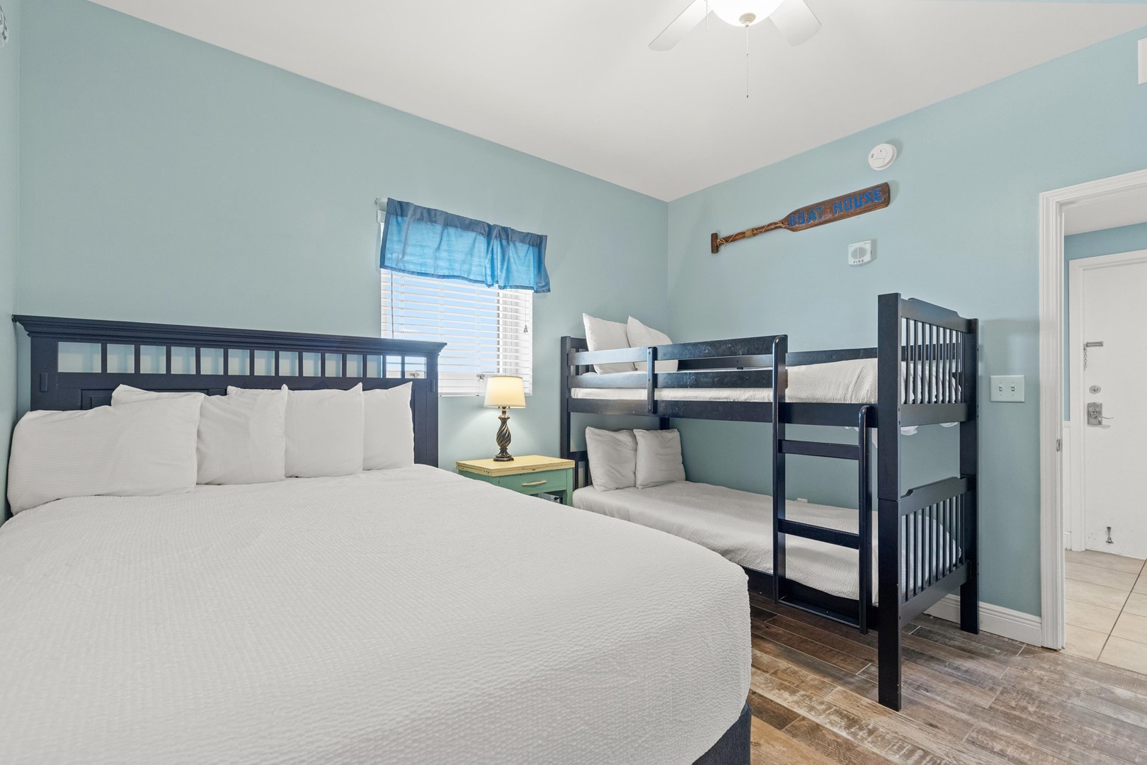 * Bedroom 2 - Gulf View, Queen Bed + Bunk (T/T), Balcony Access, TV, En Suite Bathroom