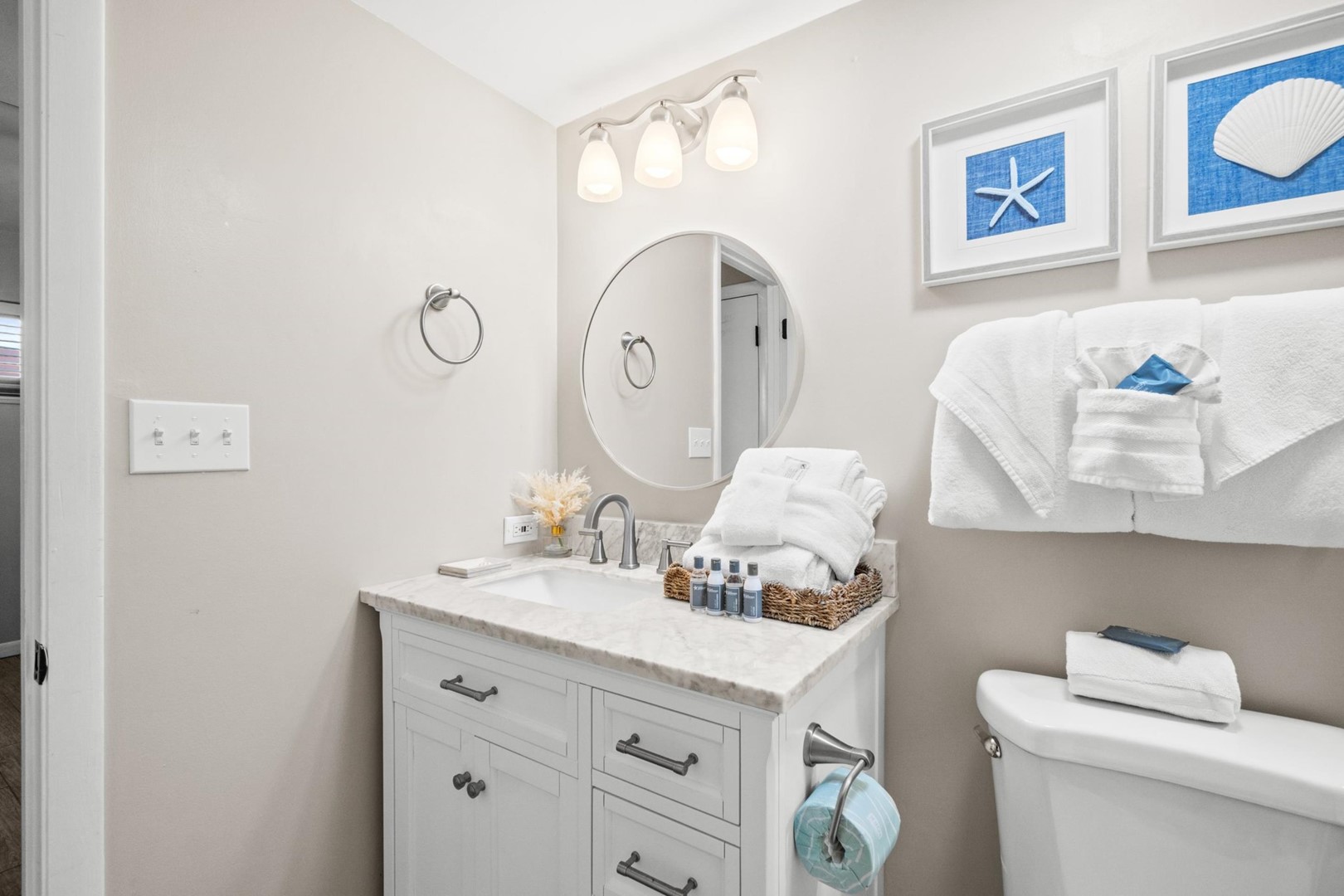 Panhandle Getaways furnishes a few essential items for guests to utilize until they can get to the grocery store. Initial Supplies include: Dishwasher soap, small washing machine powder, each bathroom has amenities (like hotel but NOT restocked) shampoo, conditioner, soap bar and body wash. One roll of toilet paper in each bathroom & one paper towel roll in the kitchen. All bed linens & towels are provided. We encourage guests to bring beach towels for use at the pool and beach.