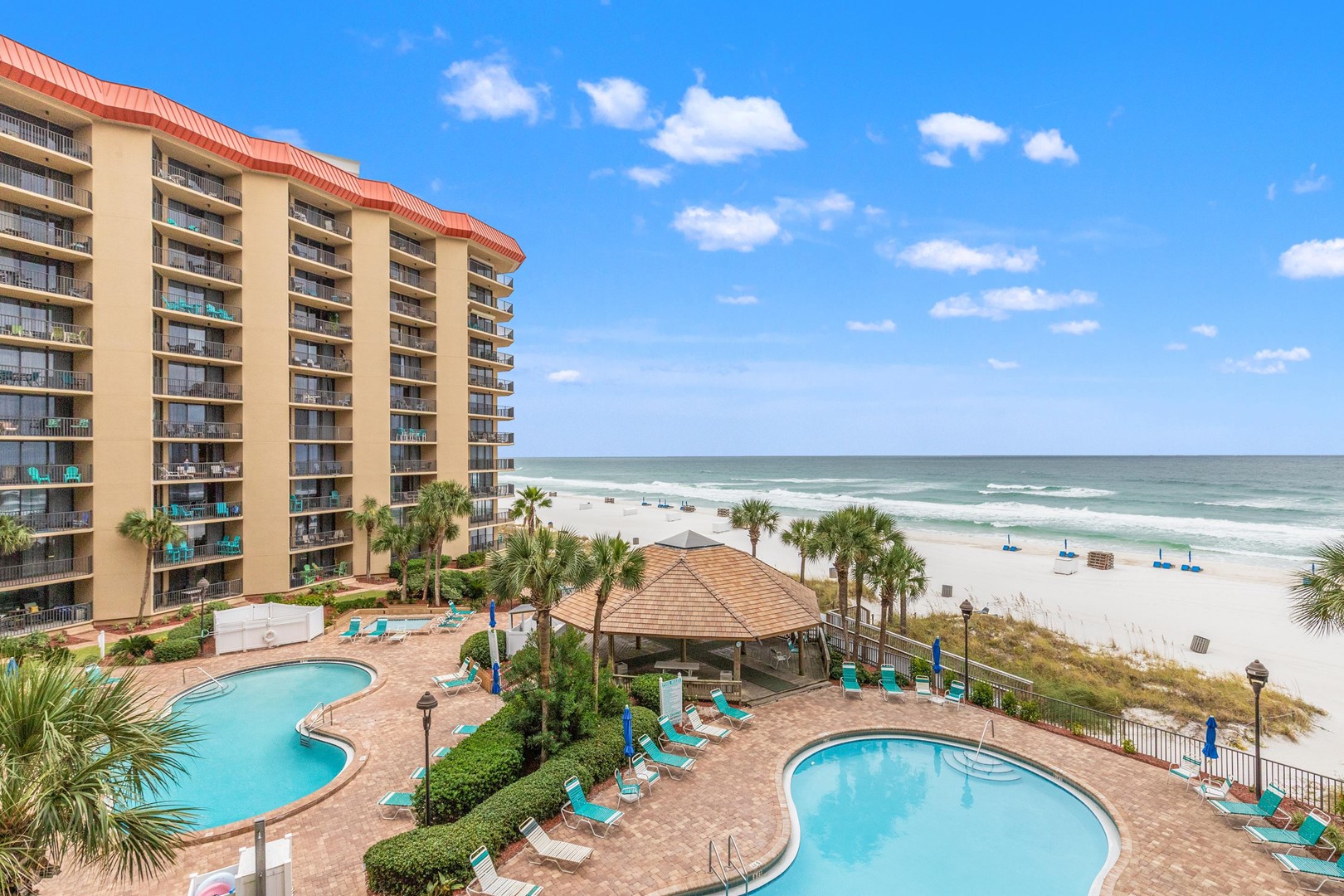 Located directly on the Gulf of Mexico, Summerhouse features two-bedroom, two-bath units, each with a balcony overlooking the gulf waters. Summerhouse is found on the east end of PCB, convenient to all the action the coastal town offers. Guests have full access to a wide range of amenities that include two gulf front pools, gazebo, hot tub, jet ski rentals and more beach services, pickleball and tennis courts, beach volleyball, and so much more. From Memorial Day through August, Summerhouse hosts summer movies under the stars, live music, karaoke, face painting for the kids, all sure to enhance your time spent there. The resort also has beach wheelchairs available for those who may need them.
