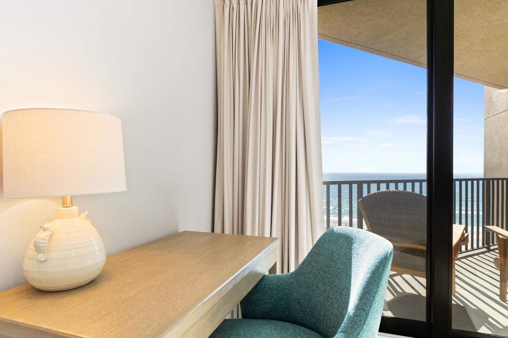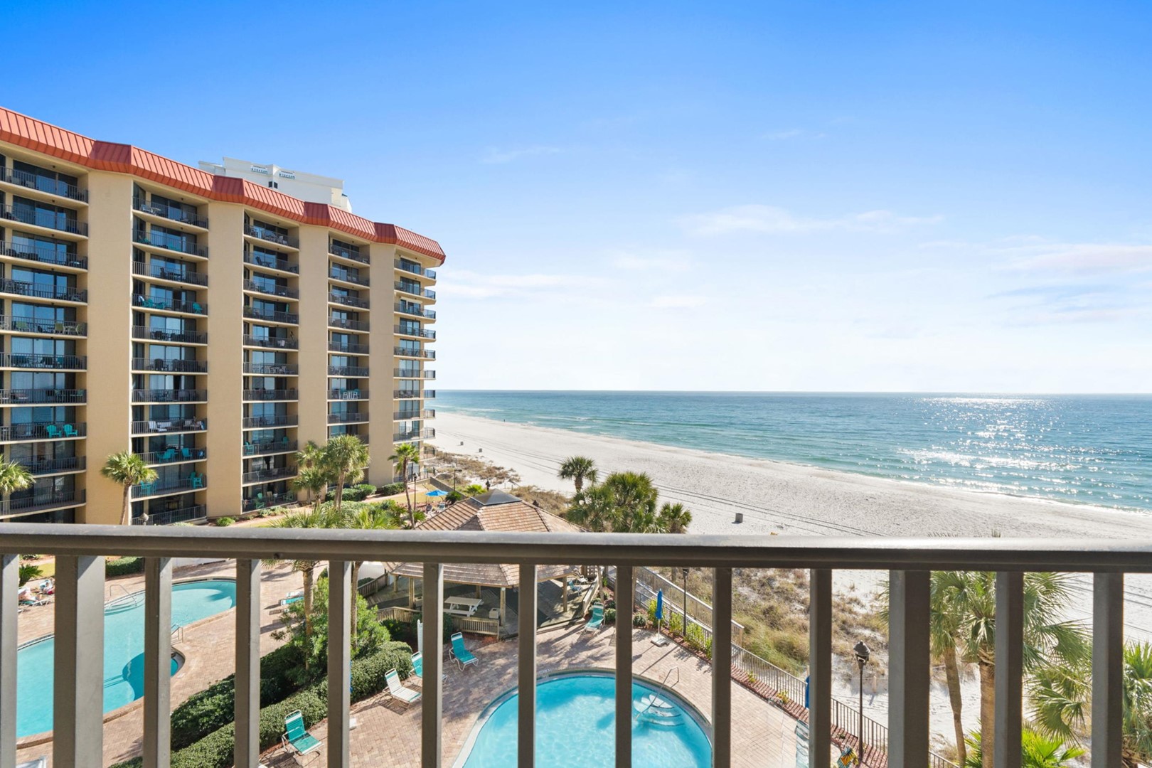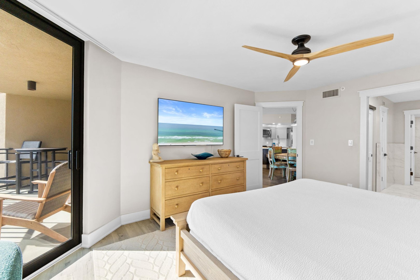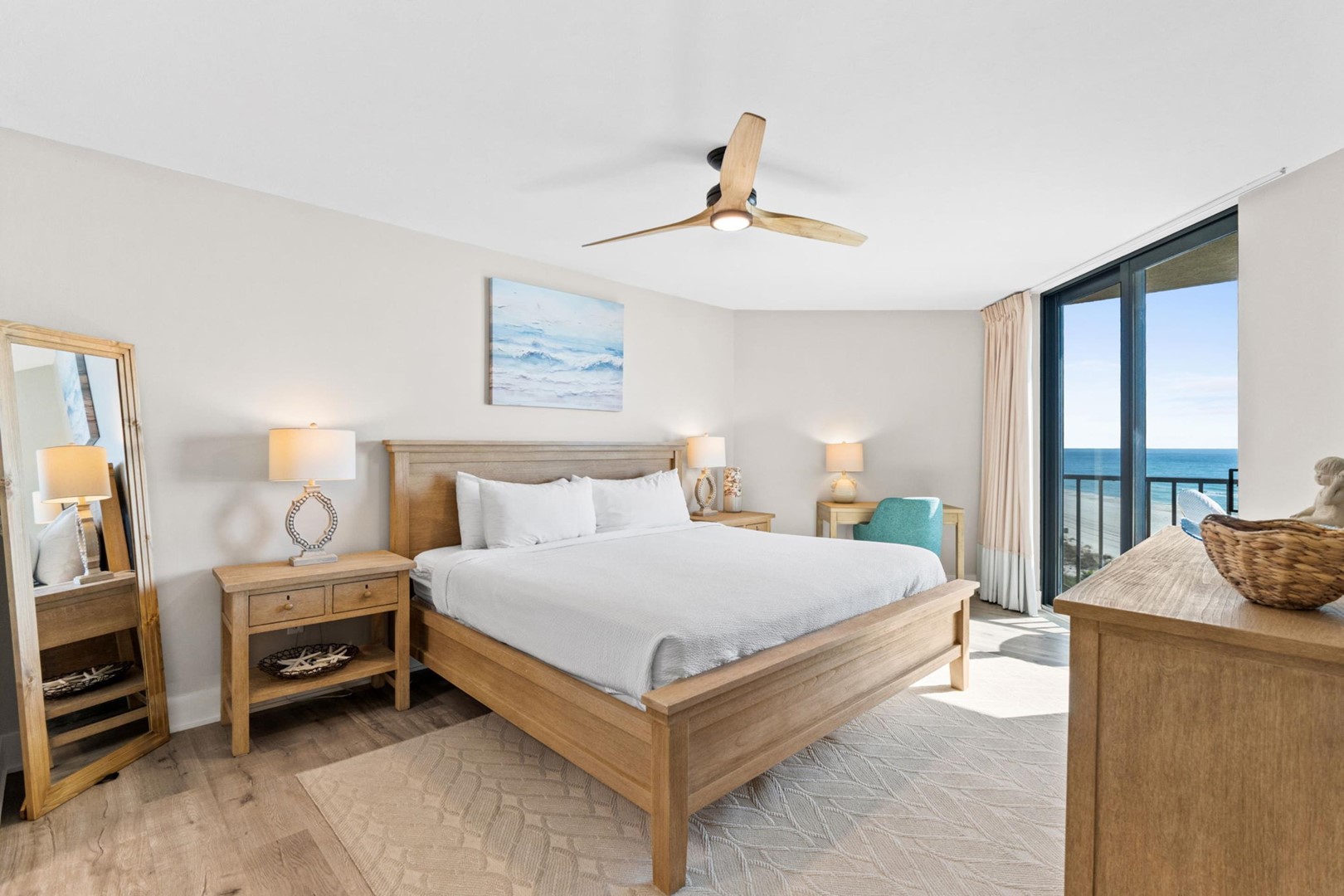 This spacious unit comfortably accommodates up to 8 guests and offers stunning views of the emerald waters and resort-style pool—visible from your private balcony, the living room, and the primary bedroom.