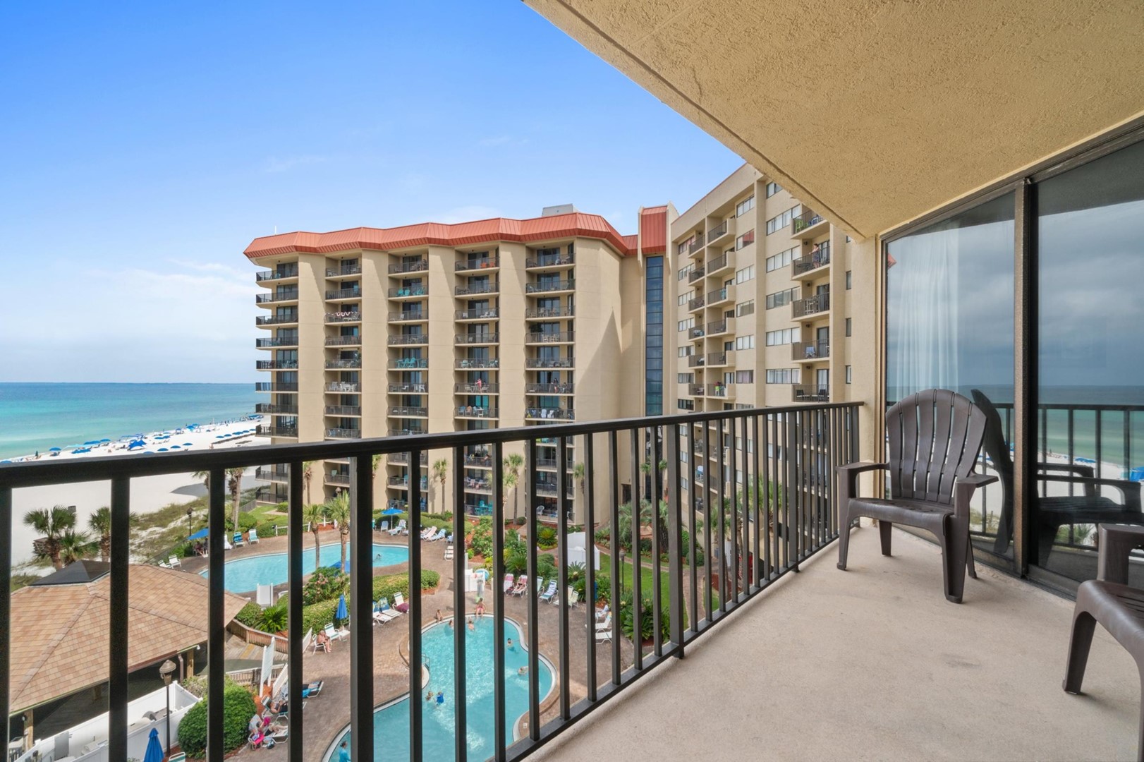 Located directly on the Gulf of Mexico, Summerhouse features two-bedroom, two-bath units, each with a balcony overlooking the gulf waters. Summerhouse is found on the east end of PCB, convenient to all the action the coastal town offers. Guests have full access to a wide range of amenities that include two gulf front pools, gazebo, hot tub, jet ski rentals and more beach services, pickleball and tennis courts, beach volleyball, and so much more. From Memorial Day through August, Summerhouse hosts summer movies under the stars, live music, karaoke, face painting for the kids, all sure to enhance your time spent there. The resort also has beach wheelchairs available for those who may need them.