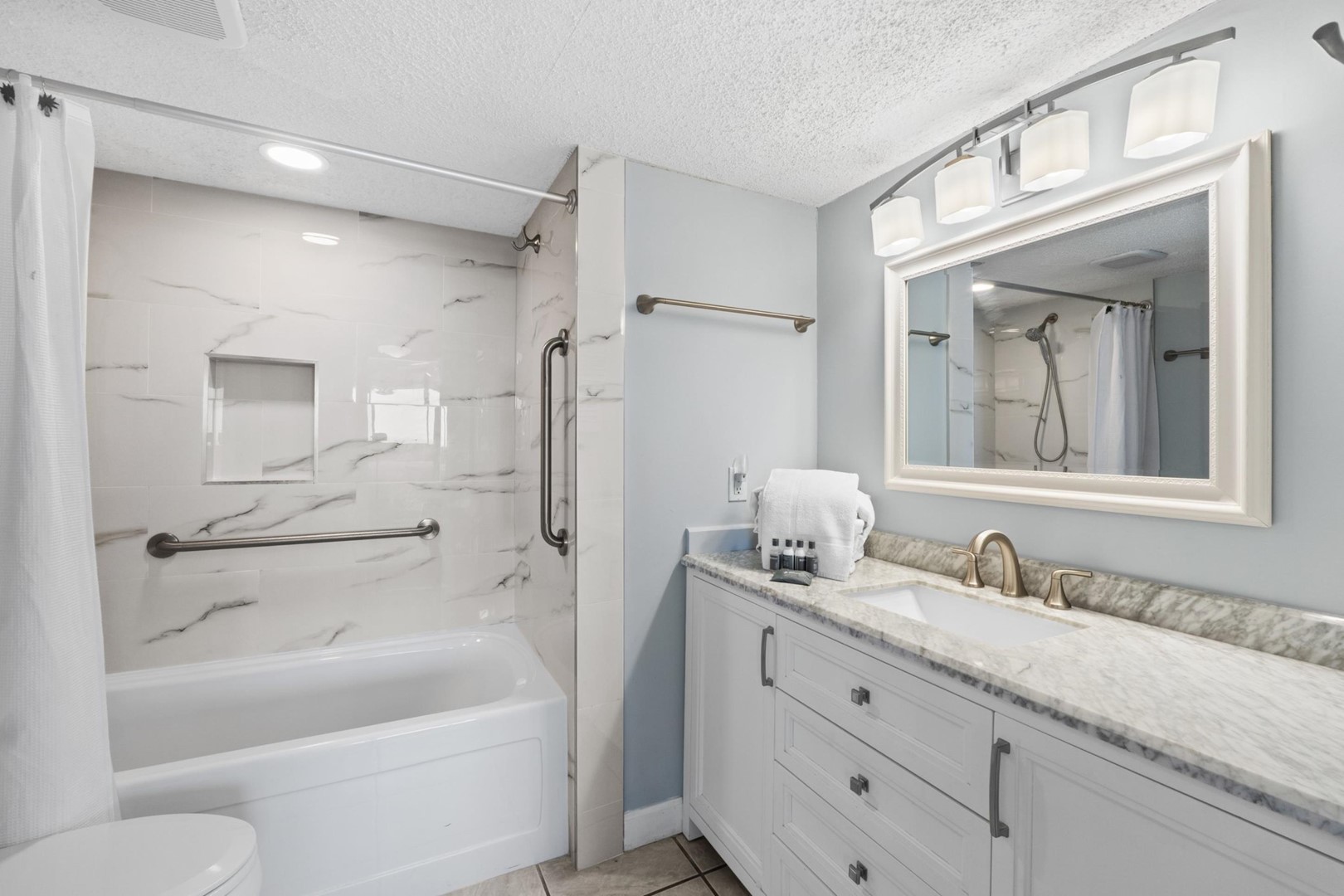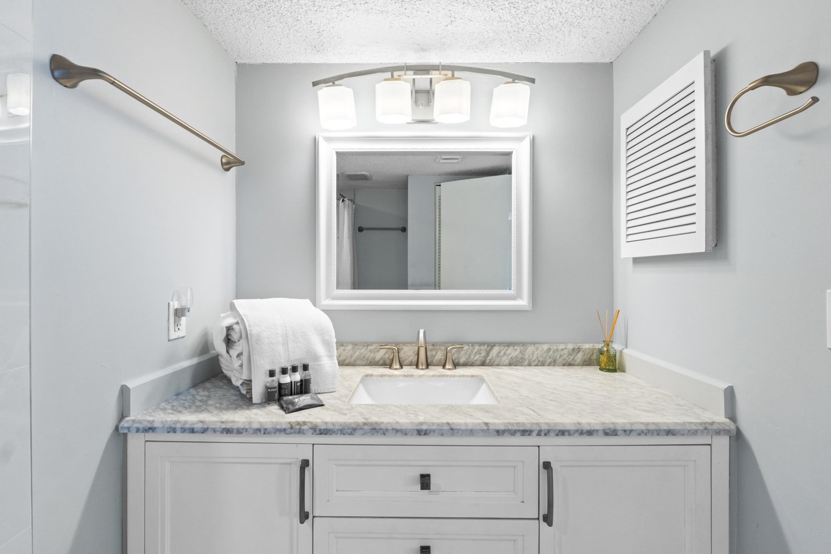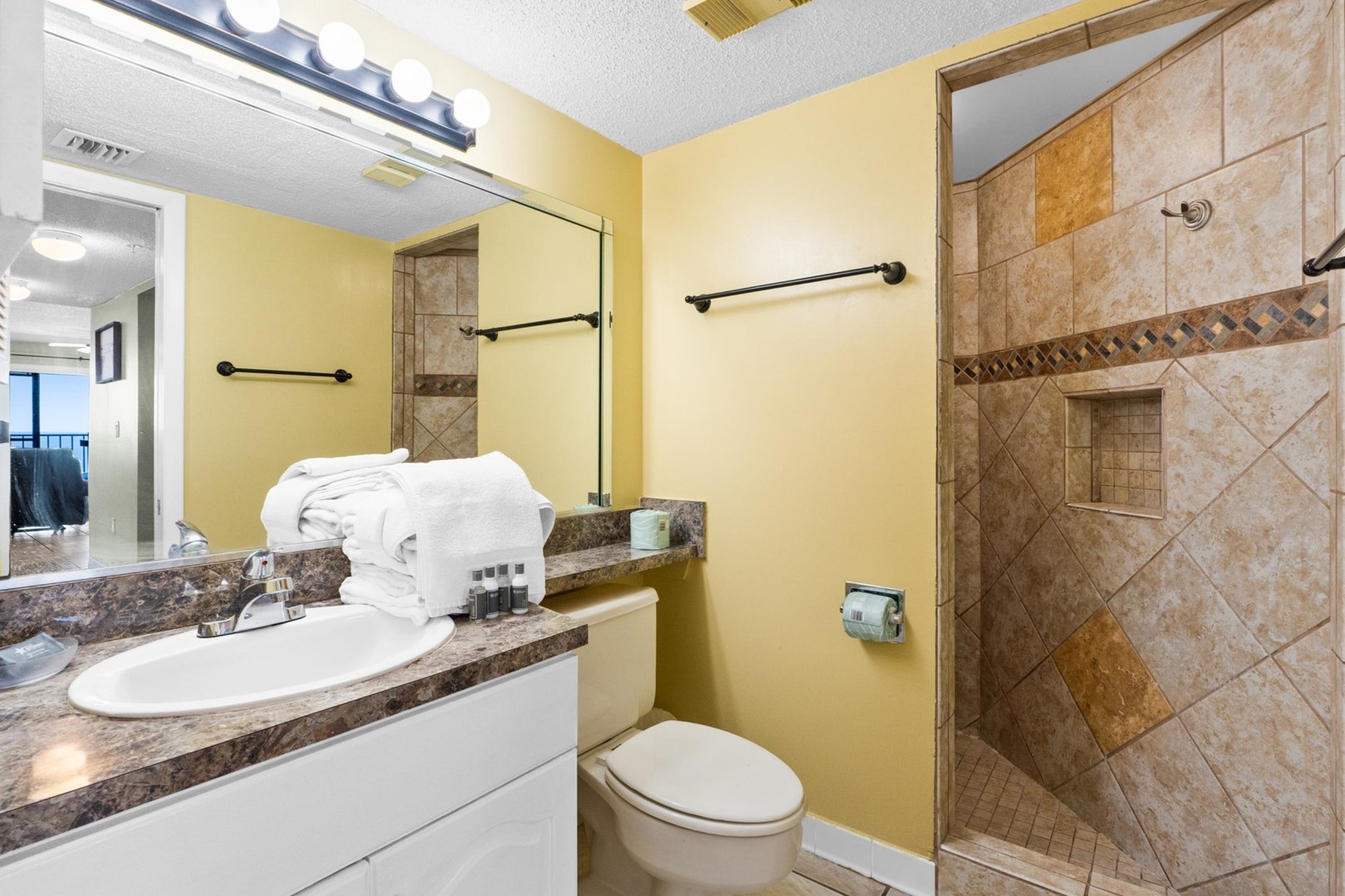 Panhandle Getaways furnishes a few essential items for guests to utilize until they can get to the grocery store. Initial Supplies include: Dishwasher soap, small washing machine powder, each bathroom has amenities (like hotel but NOT restocked) shampoo, conditioner, soap bar and body wash. One roll of toilet paper in each bathroom & one paper towel roll in the kitchen. All bed linens & towels are provided. We encourage guests to bring beach towels for use at the pool and beach.
