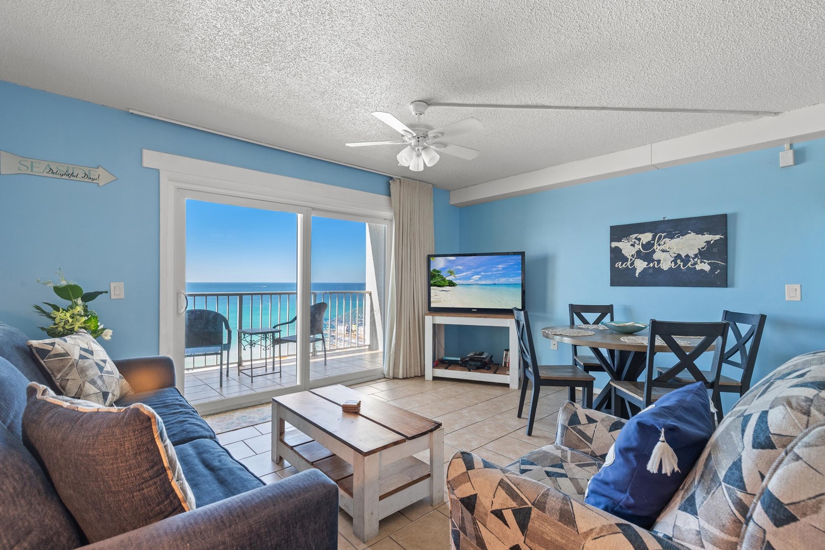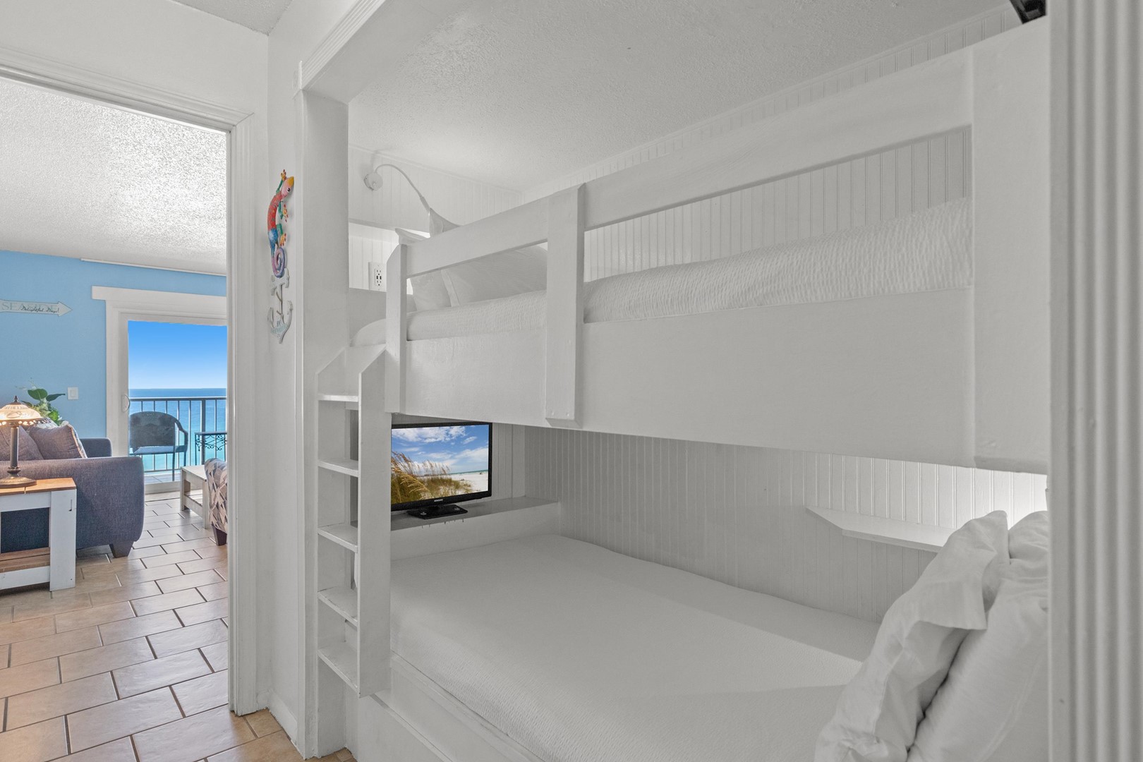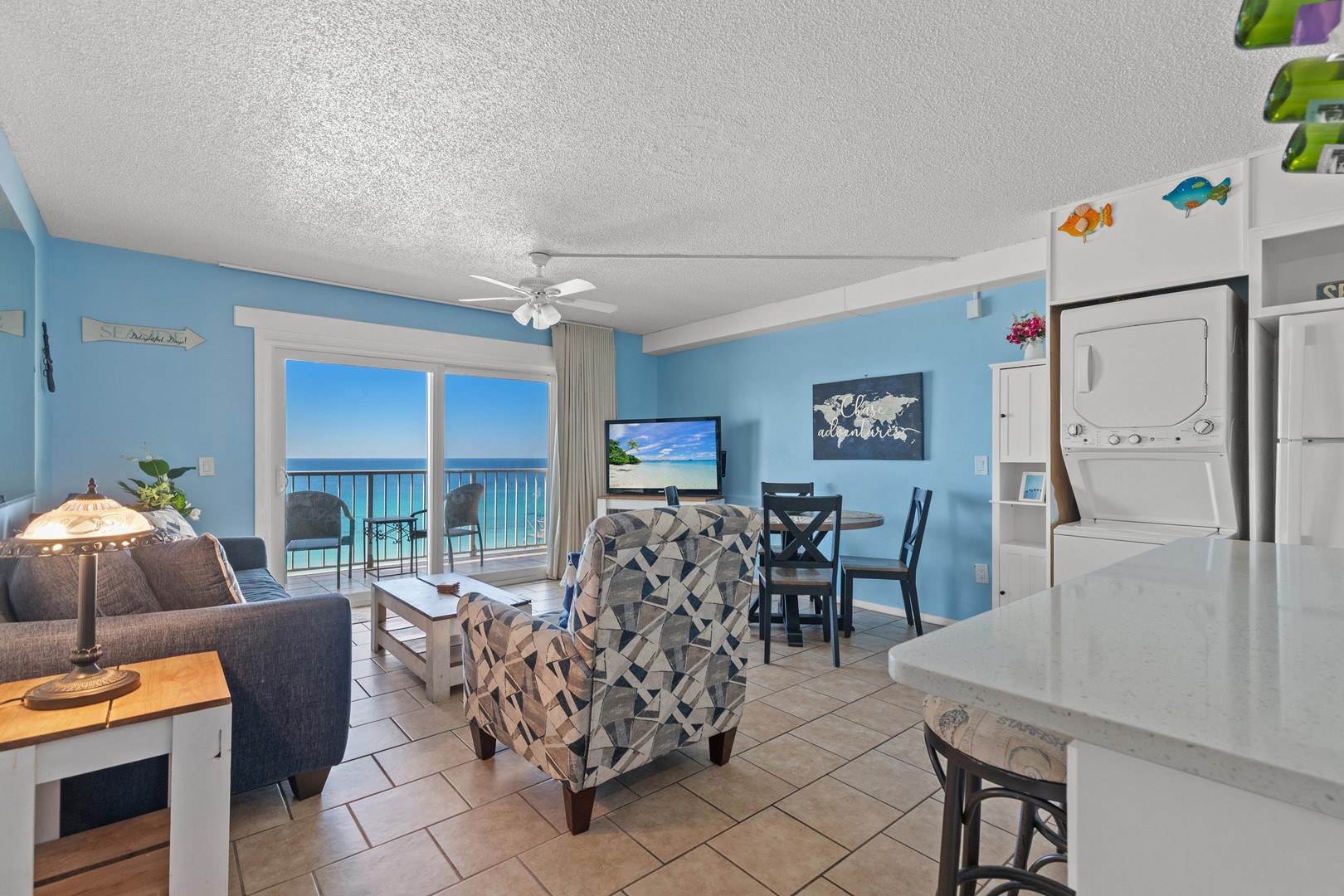 • Living area with Gulf views, 65" TV, and queen sleeper sofa