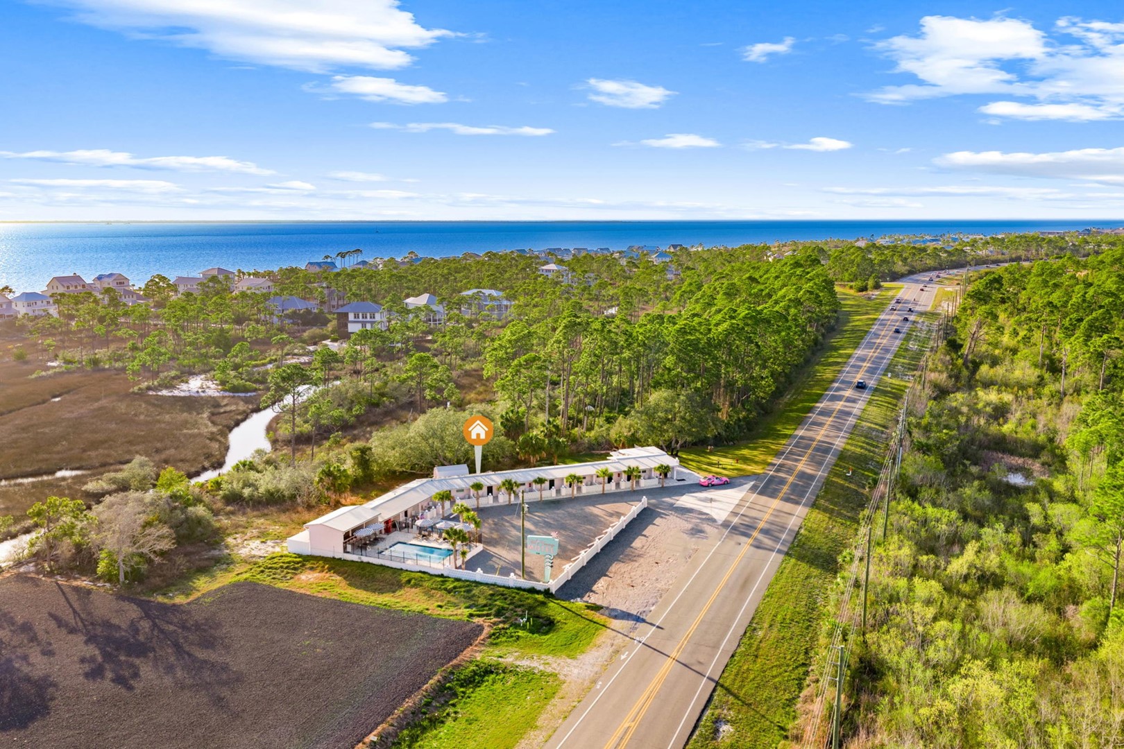 Welcome to The Pink Flamingo Boutique Motel, your own private slice of Florida’s Forgotten Coast. Located along scenic US Highway 98, this nostalgic roadside gem has been beautifully reimagined into a vibrant, retro-inspired retreat designed exclusively for unforgettable group getaways.
