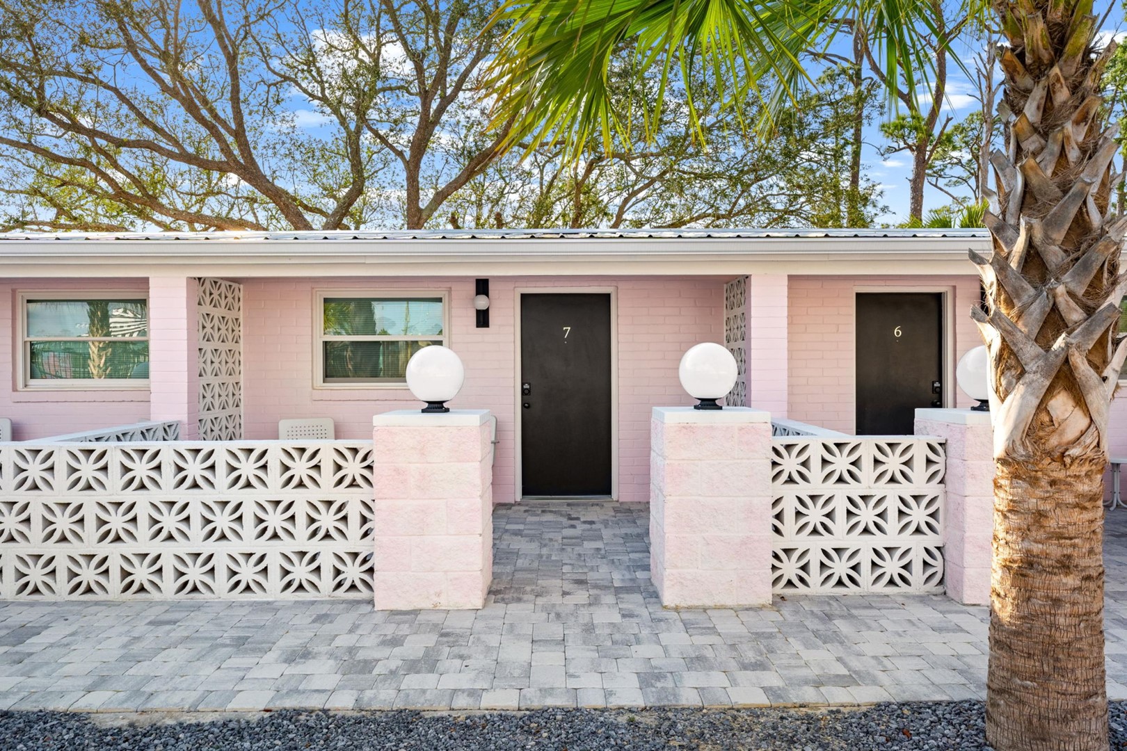 The Pink Flamingo rental, Violet Valentino, by Panhandle Getaways is a retro-chic boutique motel room in Port St. Joe, FL, featuring trendy décor, a heated pool, and a prime location near the beach.