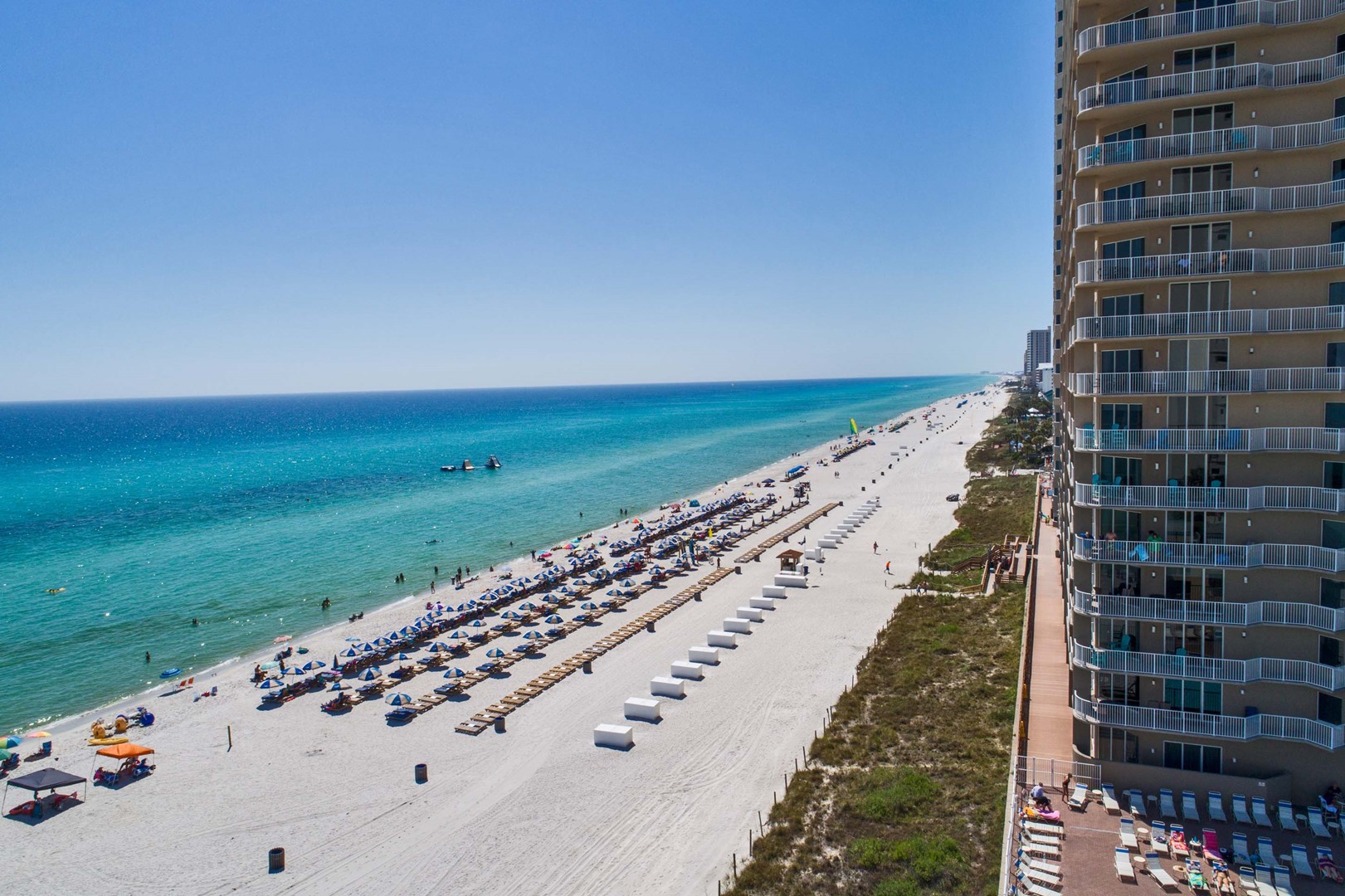 Tidewater Beach Resort has impressive amenities: two 4,200 square foot outdoor lagoon pools with hot tubs, a heated indoor pool, a state-of-the-art fitness center with Roman Spa, steam room and sauna, theater-style movie/media center, arcade/game room, restaurant, coffee shop and tiki bar. Best of all, Tidewater Beach Resort is just a quick walk or bike ride away from City Pier (great for fishing and marine life watching) and Pier Park, the new entertainment, shopping and dining hub of West Panama City Beach and beyond!