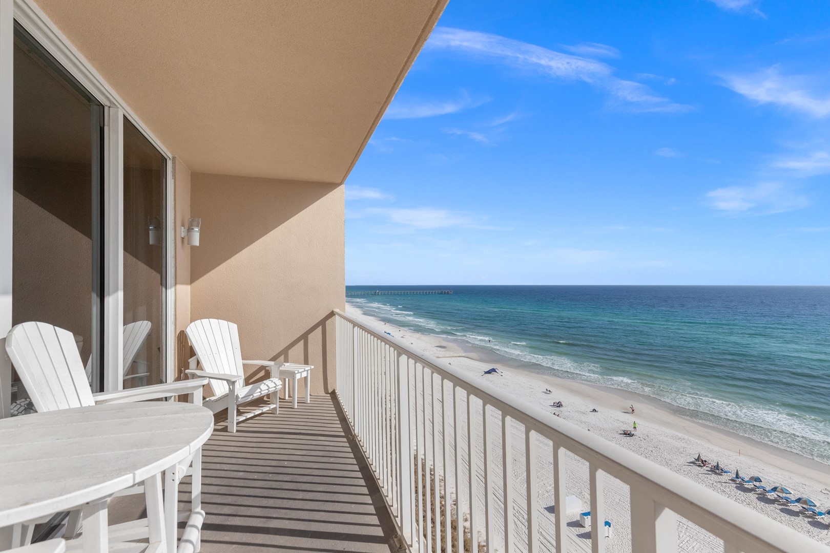 Tidewater Beach Resort has impressive amenities: two 4,200 square foot outdoor lagoon pools with hot tubs, a heated indoor pool, a 4,300 square foot state-of-the-art fitness center with Roman Spa, steam room and sauna, a theater-style movie/media center, a game arcade, restaurant, coffee shop and tiki bar. Best of all, the building is only a short walk or bike ride away from City Pier (great for fishing and marine life watching) and Pier Park.